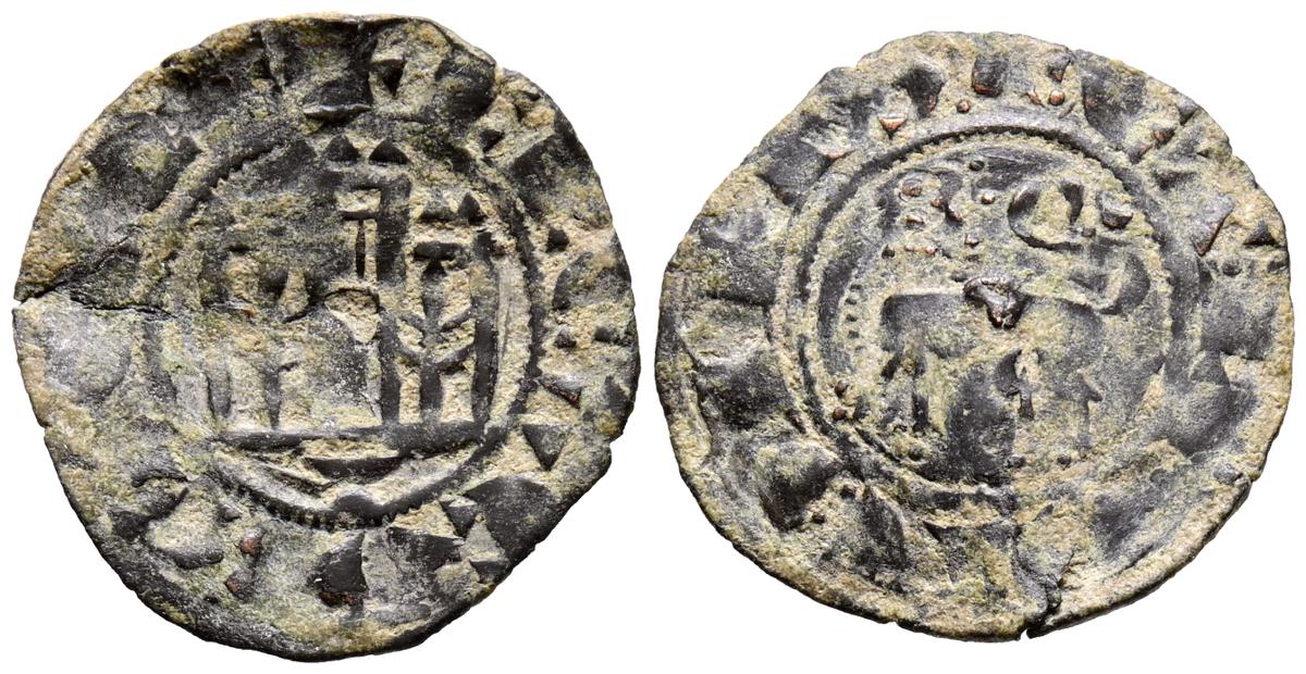 FERNANDO IV (1295-1312). Dinero. (Ve. 0,99g/19mm). Indeterminada, marca de ceca tres puntos. (Imperatrix F4:2.43; FAB-328 como pepión). Anv: Castillo, debajo tres puntos, todo dentro de gráfila circular, alrededor leyenda: F REX CASTELLE. Rev: León a izquierda dentro de gráfila circular: ET LEGIONIS. MBC.