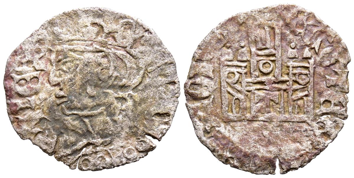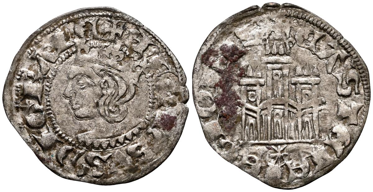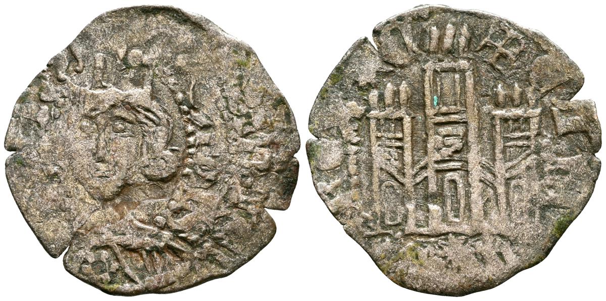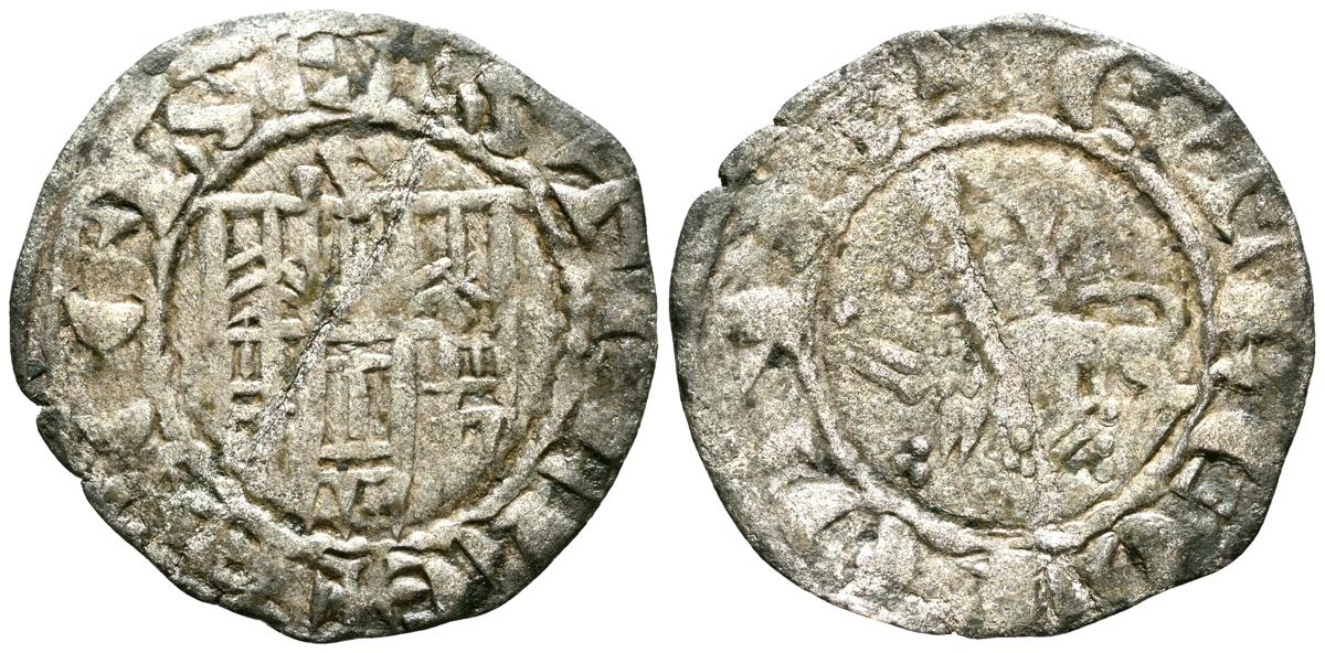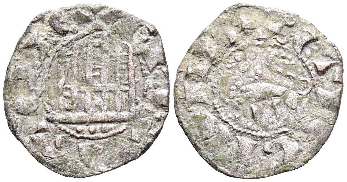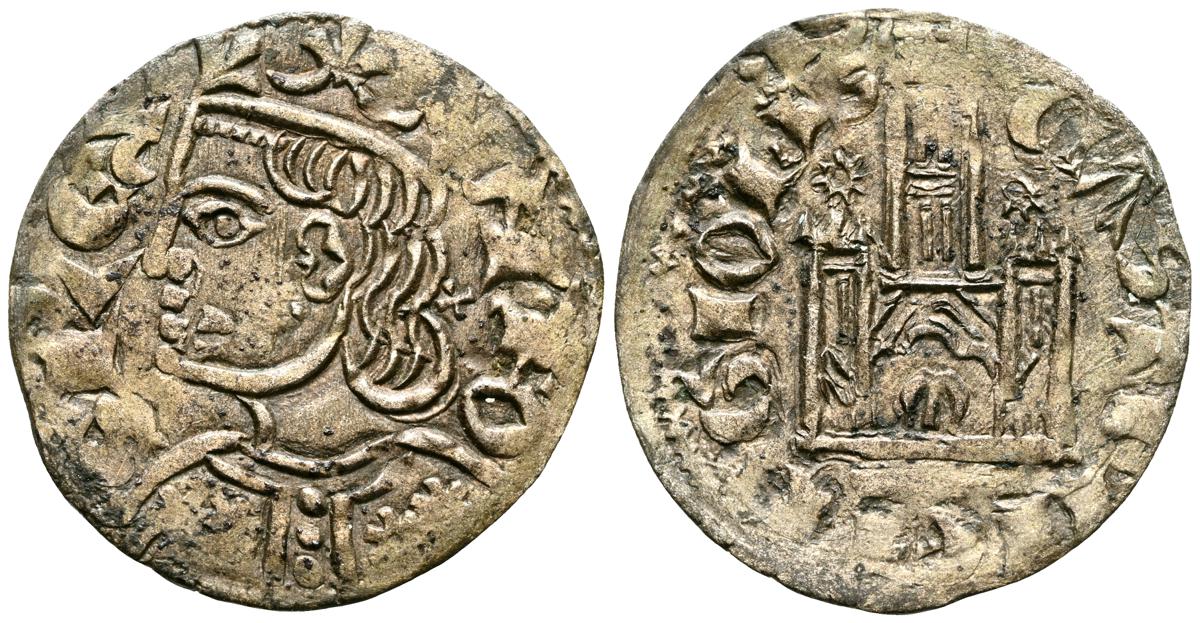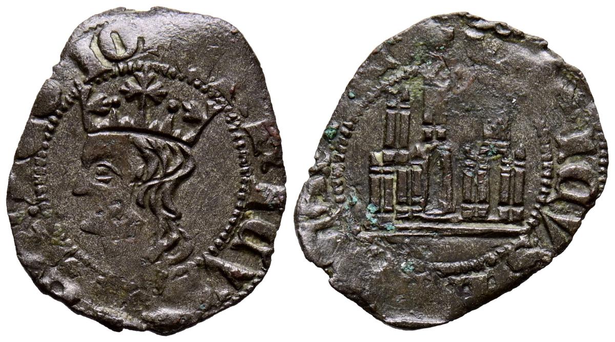 ENRIQUE II (1369-1379). Cornado. (Ve. 0,72g/18mm). Sin marca de ceca. (FAB no cita). Anv: Busto coronado de Enrique II a izquierda dentro de gráfila perlada, alrededor leyenda: ENRICVS REX LEGIO. Rev: Castillo dentro de gráfila perlada, alrededor leyenda: ENRICVS REX CAST. MBC+. Oxidaciones en reverso. Escasa.