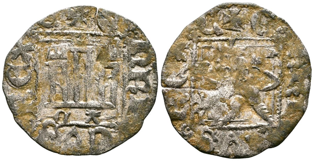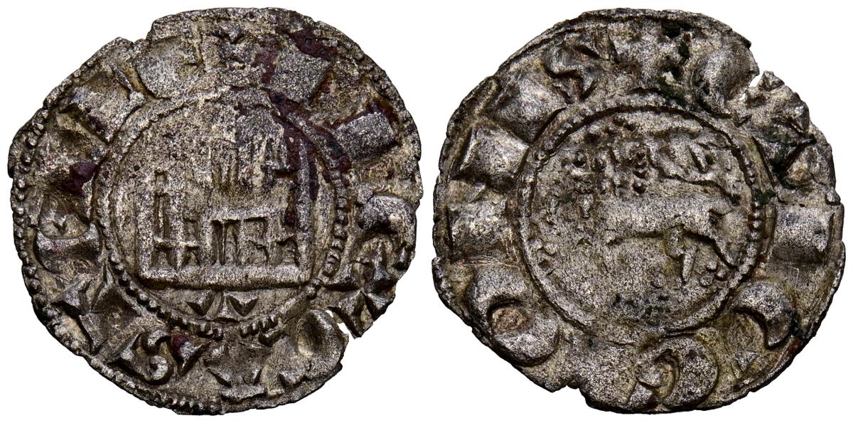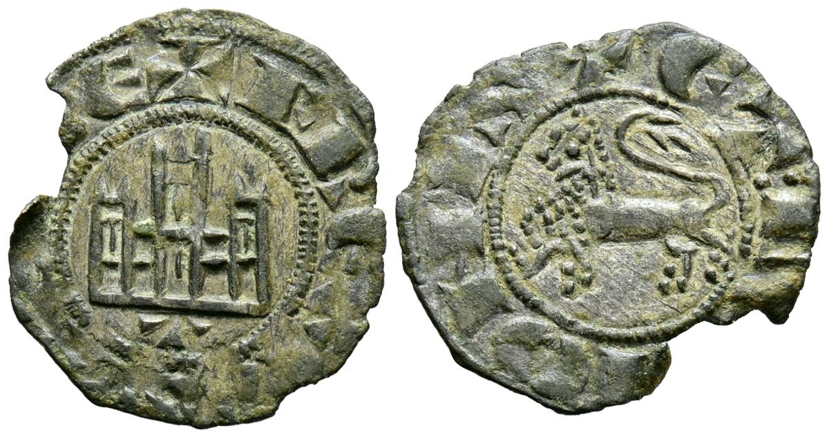ALFONSO XI (1312-1350). Dinero Novén. (Ve. 0,76g/18mm). Sevilla. (FAB-358.1 var). Anv: Castillo, debajo S tumbada encima de la torre izquierda, todo dentro de gráfila cuadrada, alrededor leyenda: ALF REX CASTELLE. Rev: León pasando a izquierda, alrededor leyenda: ET LEGIONIS. MBC. Falta en cospel. Escasa.