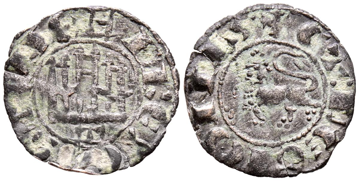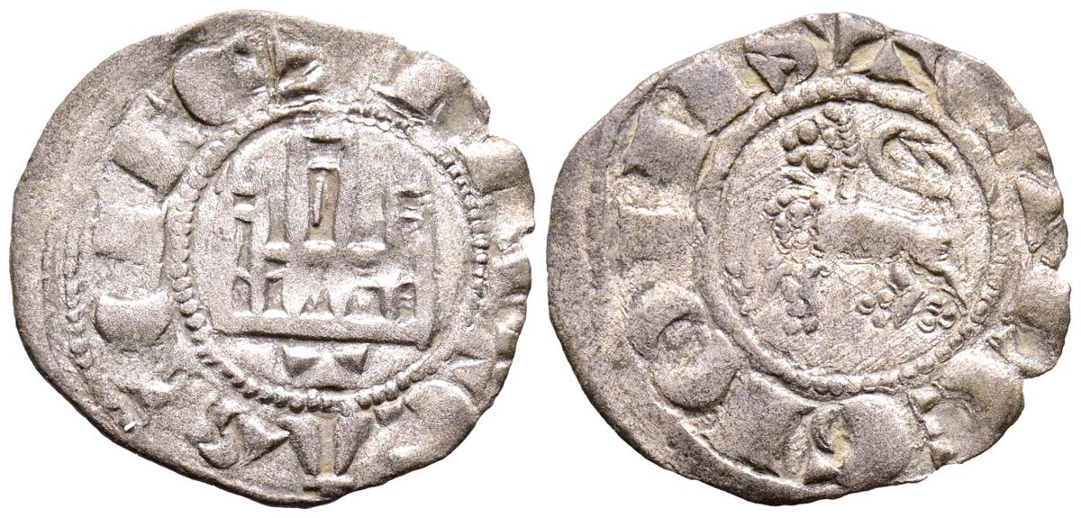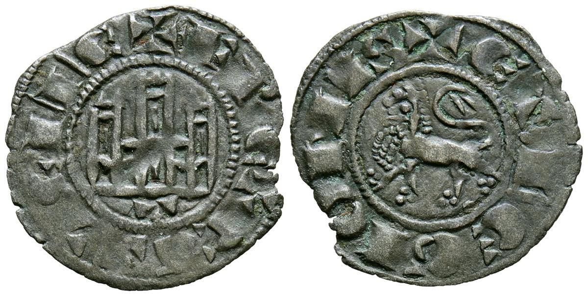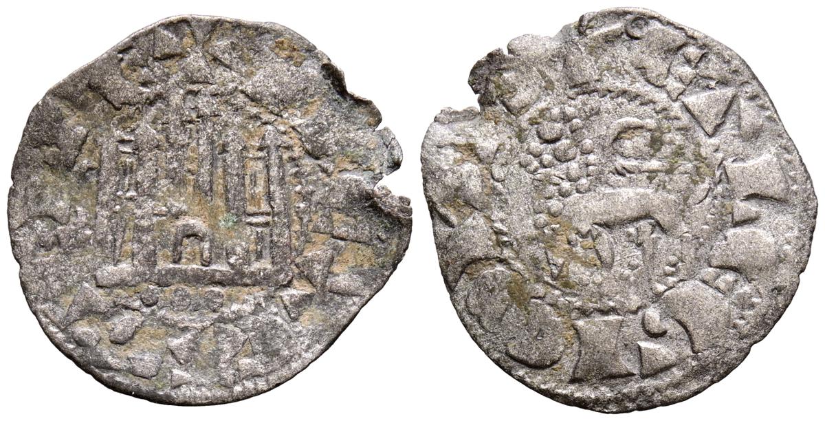 FERNANDO IV (1295-1312). Dinero. (Ve. 0,74g/19mm). Marca de ceca: Tres puntos. (Imperatrix F4:2,46; FAB-328, como Pepión). Anv: Castillo, debajo: Tres puntos, todo dentro de gráfila circular, alrededor leyenda: F REX CASTELLE. Rev: León rampante a izquierda dentro de gráfila circular, alrededor leyenda: ET LEGIONIS. MBC.