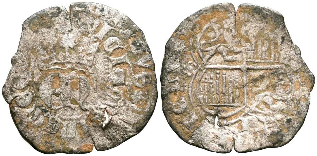 ENRIQUE II (1368-1379). Real de vellón. (Ve. 2,10g/26mm). Sevilla. (Momeca 57.1L.2; FAB-422). Anv: Anagrama EN coronado, alrededor leyenda en doble orla: DOMINVS MICHI ADIVTOR ET EGO DISPICIAM INIMICO. Rev: Cuartelado de castillos y leones rampantes a izquierda dentro de gráfila lobular, debajo: S, con florones en los lóbulos, alrededor leyenda: ENRICVS DEI GRACIA REX CA. MBC-. Grieta. Escasa.