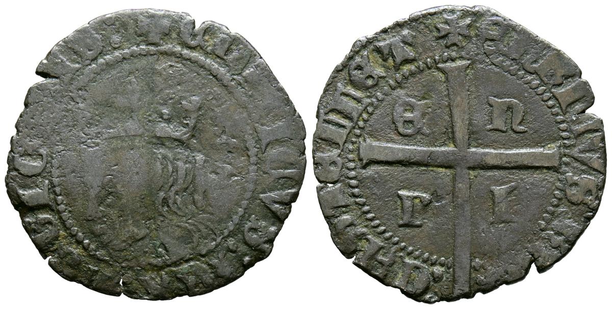 ENRIQUE II (1368-1379). Real de vellón. (Ve. 2,03g/24mm). Palencia. (Momeca 57.1G.2; FAB-420). Anv: Anagrama EN coronado, alrededor leyenda en doble orla: DOMINVS MICHI ADIVTOR ET EGO DISPICIAM INIMICO. Rev: Cuartelado de castillos y leones rampantes a izquierda dentro de gráfila lobular, debajo: P, con rosetones en los lóbulos, alrededor leyenda: ENRICVS REX CASTELLE E LEGIONIS. BC+. Cospel irregular. Rara.