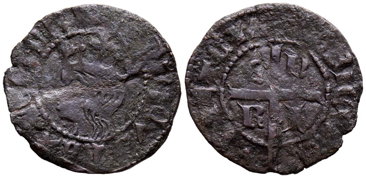 JUAN I (1379-1390). Dinero. (Ve. 0,93g/17mm). Sevilla. (Momeca 64.4B.2; FAB-578.2). Anv: Castillo, debajo S, todo dentro de gráfila cuadrada, alrededor leyenda: IOHANES REX CA. Rev: León rampante a izquierda con S delante de la zarpa, todo dentro de gráfila cuadrada, alrededor leyenda: IOHANES REX LE. MBC. Muy rara.