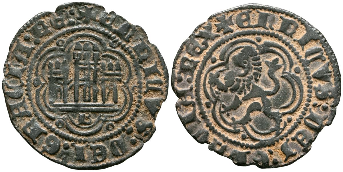 ENRIQUE III (1390-1406). Blanca. (Ae. 1,58g/24mm). Burgos. (FAB-597). Anv: Castillo, debajo B, todo dentro de gráfila polilobular, alrededor leyenda: ENRICVS DEI GRACIA RE. Rev: León rampante a izquierda dentro de gráfila lobular, alrededor leyenda: ENRICVS DEI GRACIA REX. MBC.