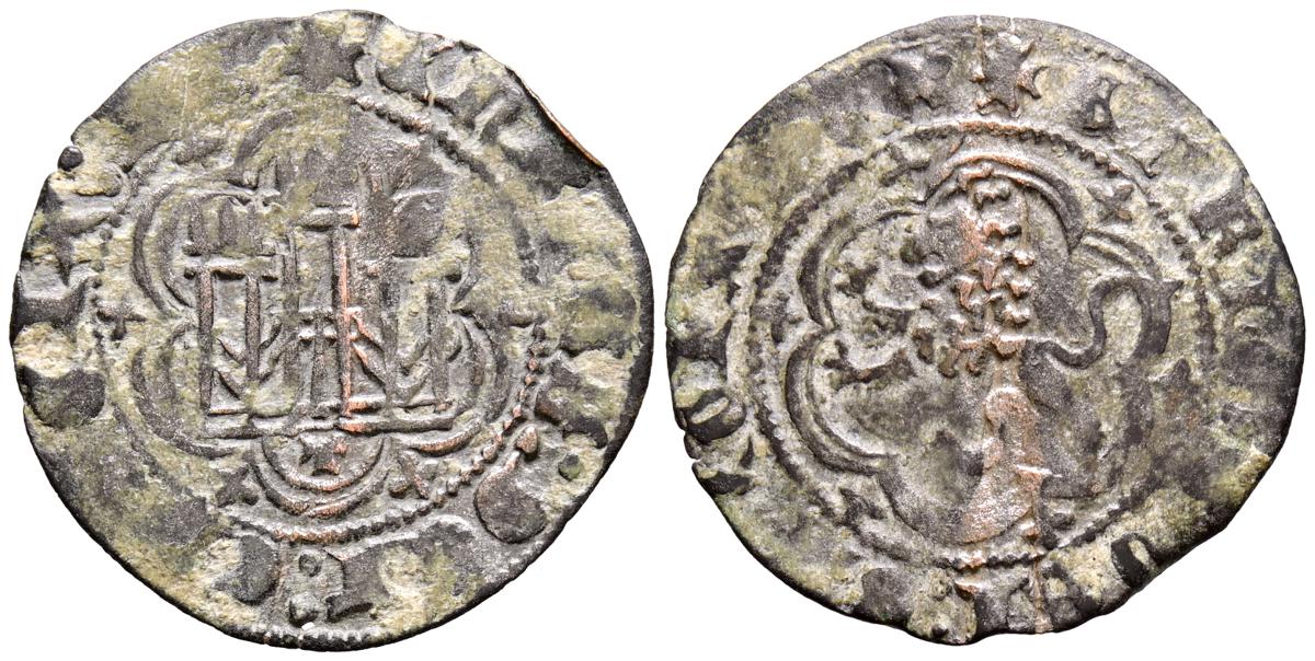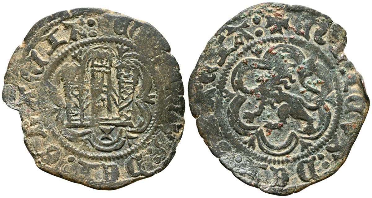 ENRIQUE IV (1454-1474). Maravedí. (Ve. 1,92g/23mm). Coruña. (Momeca 76.A07.3; FAB-793; Roma-Rueda (2025) 685, mismo ejemplar). Anv: Castillo, debajo venera, todo dentro de gráfila circular, alrededor leyenda: ENRICVS QARTVS DEI GRA RE. Rev: León coronado y rampante a izquierda con granada a sus pies, todo dentro de gráfila circular, alrededor leyenda: ENRICVS QVARTVS REX CAS. MBC-.