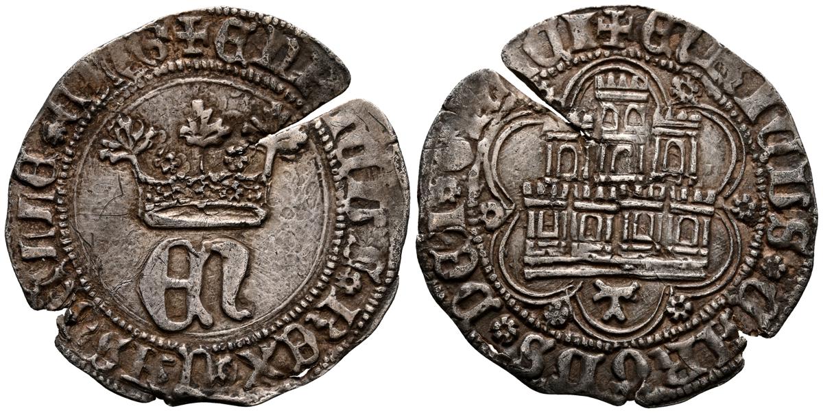 ENRIQUE IV (1454-1474). Cuartillo. (Ar. 3,30g/27mm). Sevilla. (Momeca 75.A30.1; FAB-755). Anv: Busto coronado de Enrique IV de frente, en campo a los lados ramillete de granadas, todo dentro de una gráfila circular, alrededor leyenda: ENRICVS CARTVS DEI GRACIA REX. Rev: Castillo, debajo S, todo dentro a una doble gráfila polilobular, a su vez rodeada de una circular, alrededor leyenda: ENRICVS DEI GRACIA REX CAST. MBC-.