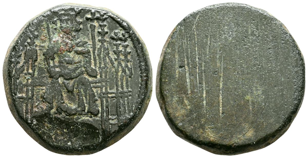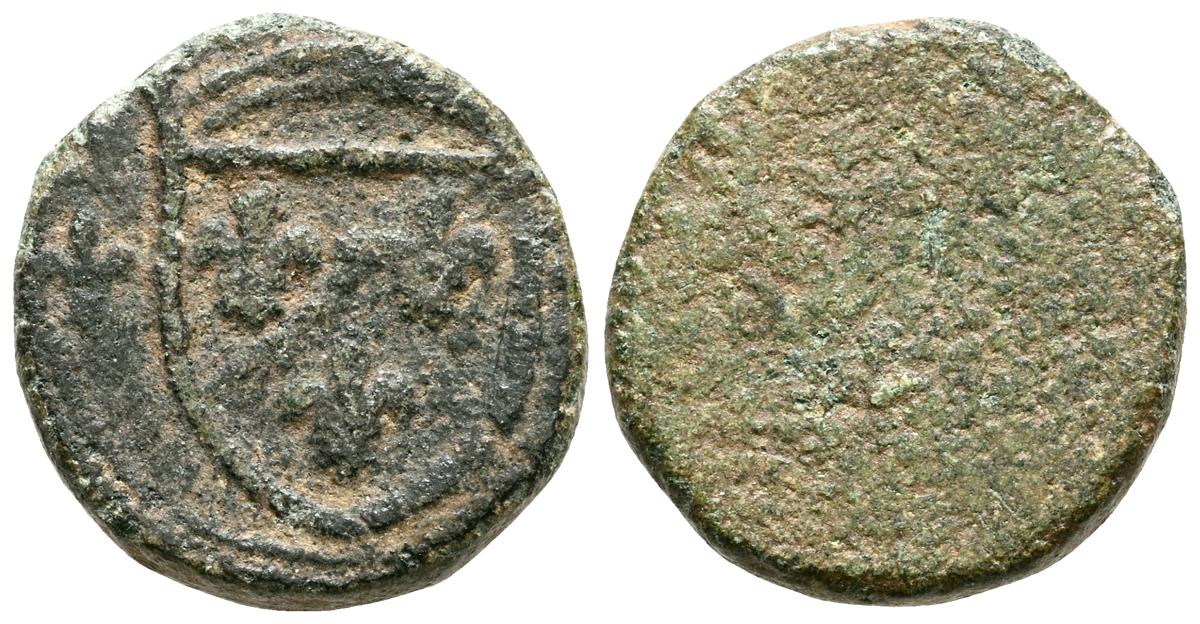 Ponderal para Enrique de la silla o lion de Carlos IV de Francia. (Ae. 4,53g/16mm). Siglo XV. (Braña; Rueda y Roma 3.1.1). Anv: Rey entronizado portando espada. Rev: Anepígrafo. MBC+. Atractivo ejemplar.