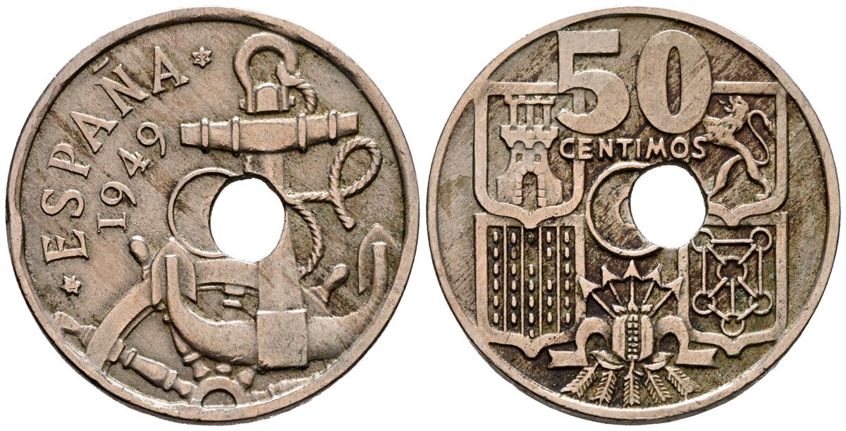 ESTADO ESPAÑOL (1936-1975). 50 Céntimos. (Cu-Ni. 4,01g/20mm). 1949 *19-54. Madrid. (Cal-2019-25). MBC+. Agujero desplazado. Primera estrella apenas visible.