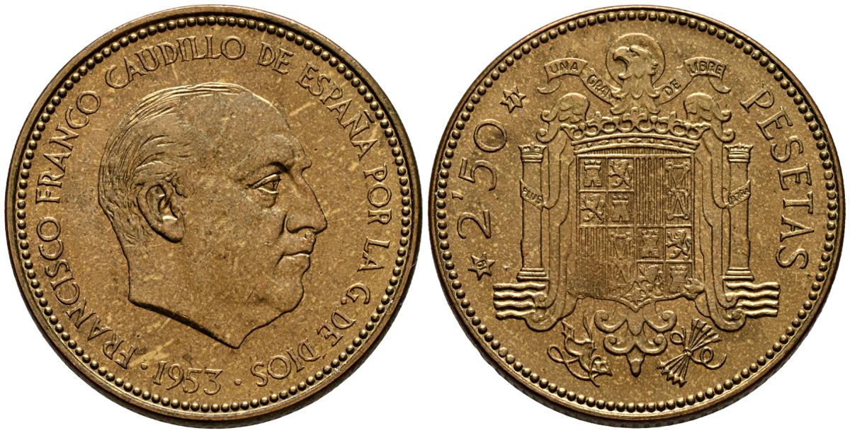 ESTADO ESPAÑOL (1936-1975). 2,50 Pesetas. (Al-Ae. 7,09g/25mm). 1953 *19-69. Madrid. (Cal-2019-88). SC. Preciosa pátina. Procedente de cartucho. Muy escaso ejemplar, tirada de 2.000 unidades.