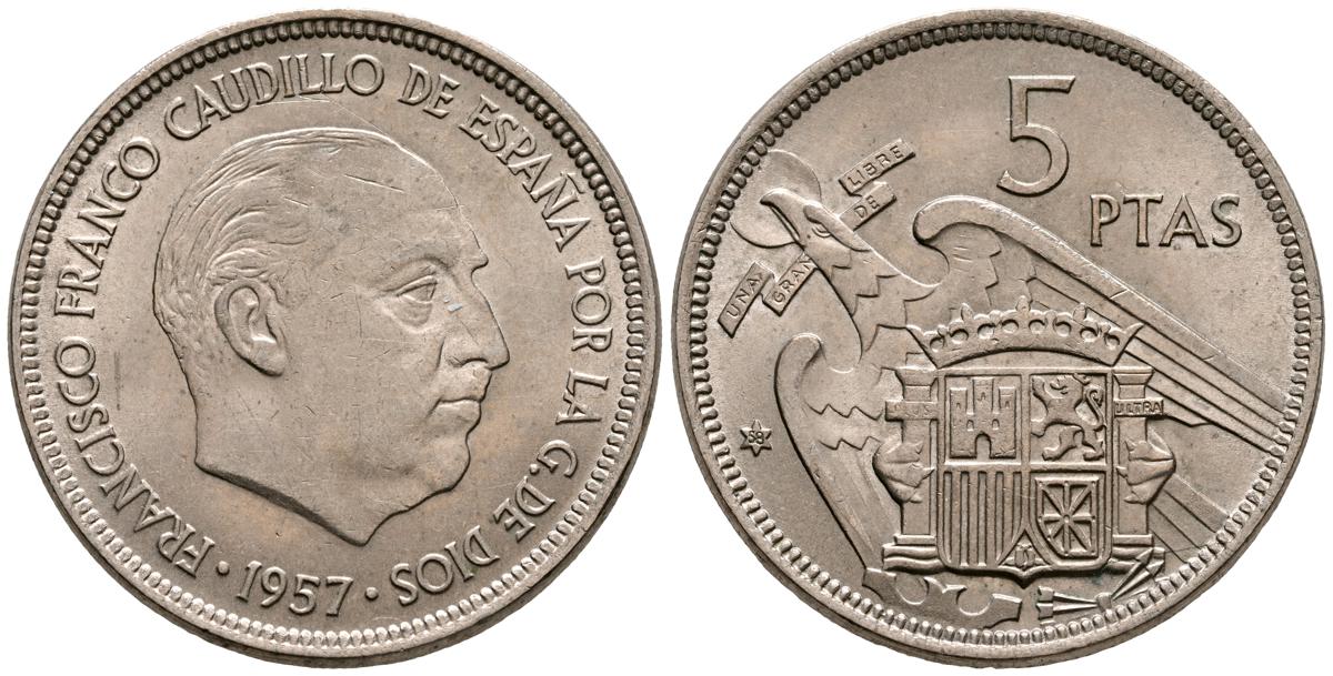 ESTADO ESPAÑOL (1936-1975). 5 Pesetas. (Ni. 5,72g/23mm). 1957 *63. Madrid. (Cal-2019-103). SC-/SC. Preciosa pátina.