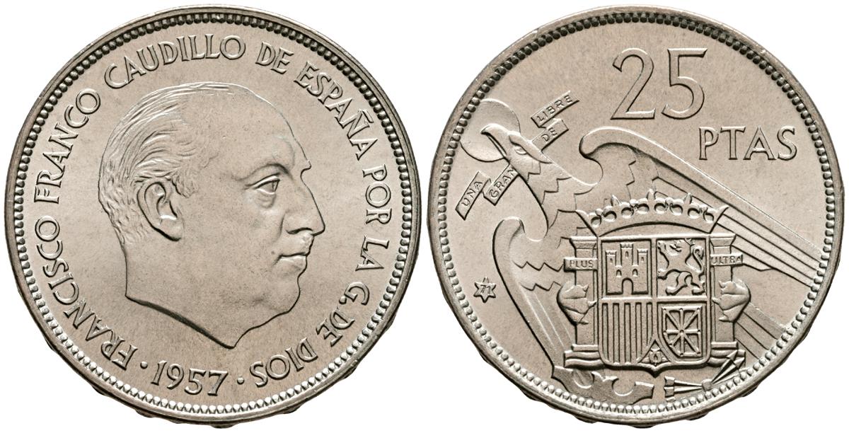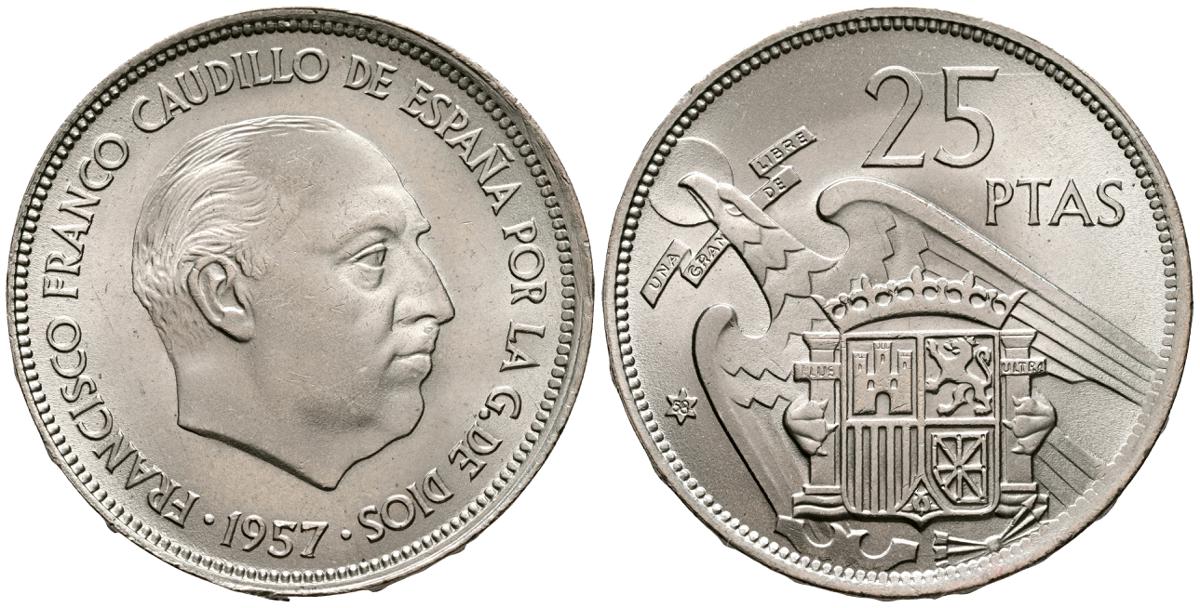 ESTADO ESPAÑOL (1936-1975). 25 Pesetas. (Ni. 8,47g/27mm). 1957 *73. Madrid. (Cal-2019-128). SC. Extraída de cartera.