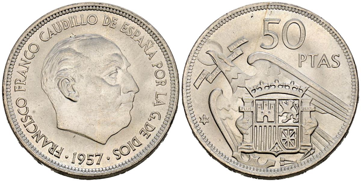 ESTADO ESPAÑOL (1936-1975). 50 Pesetas. (Ni. 12,46g/30mm). 1957 *72. Madrid. (Cal-2019-141). SC. Extraída de cartera.