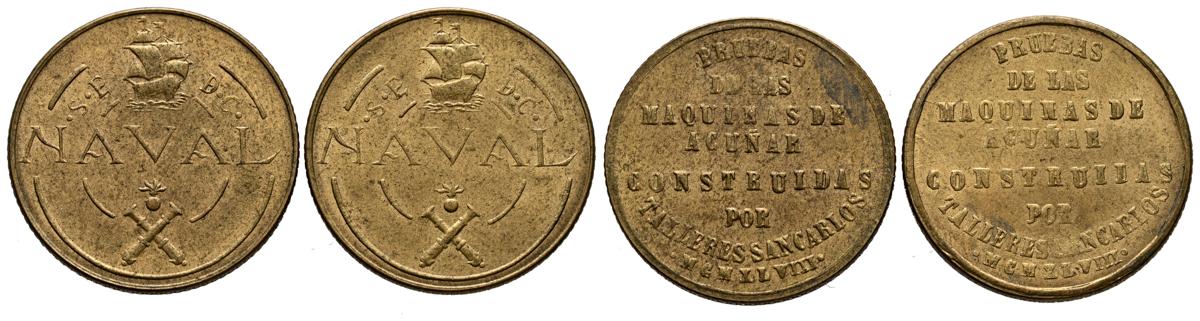 ESTADO ESPAÑOL (1936-1975). Pareja de 1 Peseta de 1948. Prueba de los Talleres San Carlos. Tipos coincidentes y no coincidentes. (Cal-2019-no cita). Excelente nivel de conservación de ambas piezas. A EXAMINAR.
