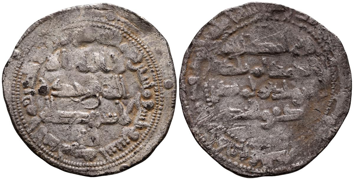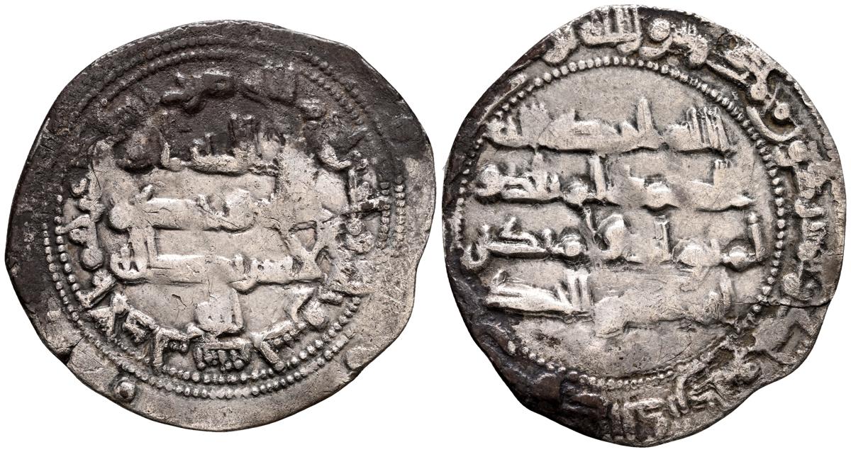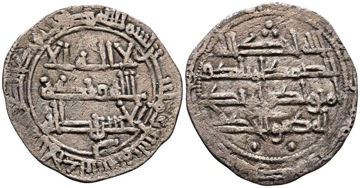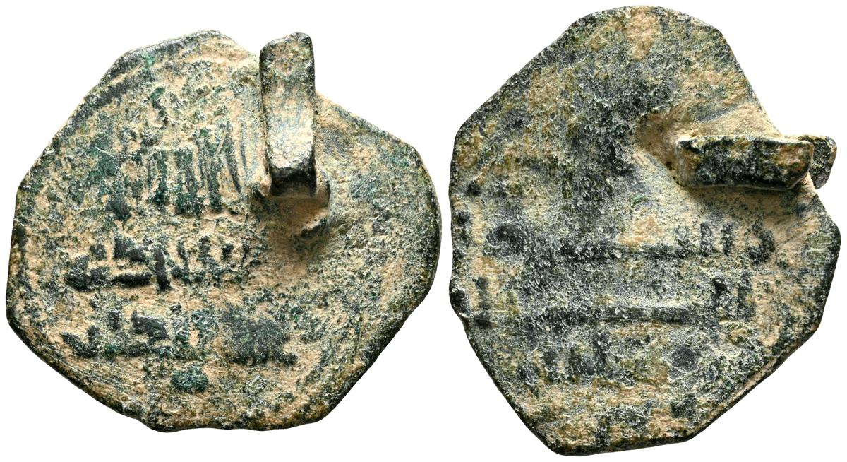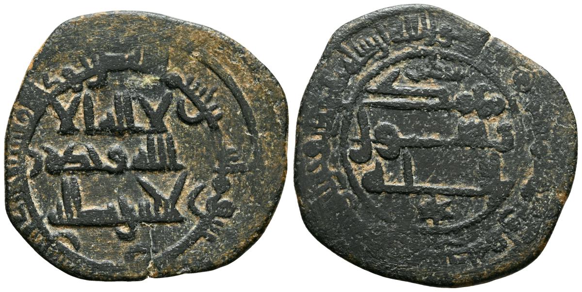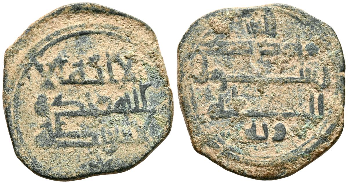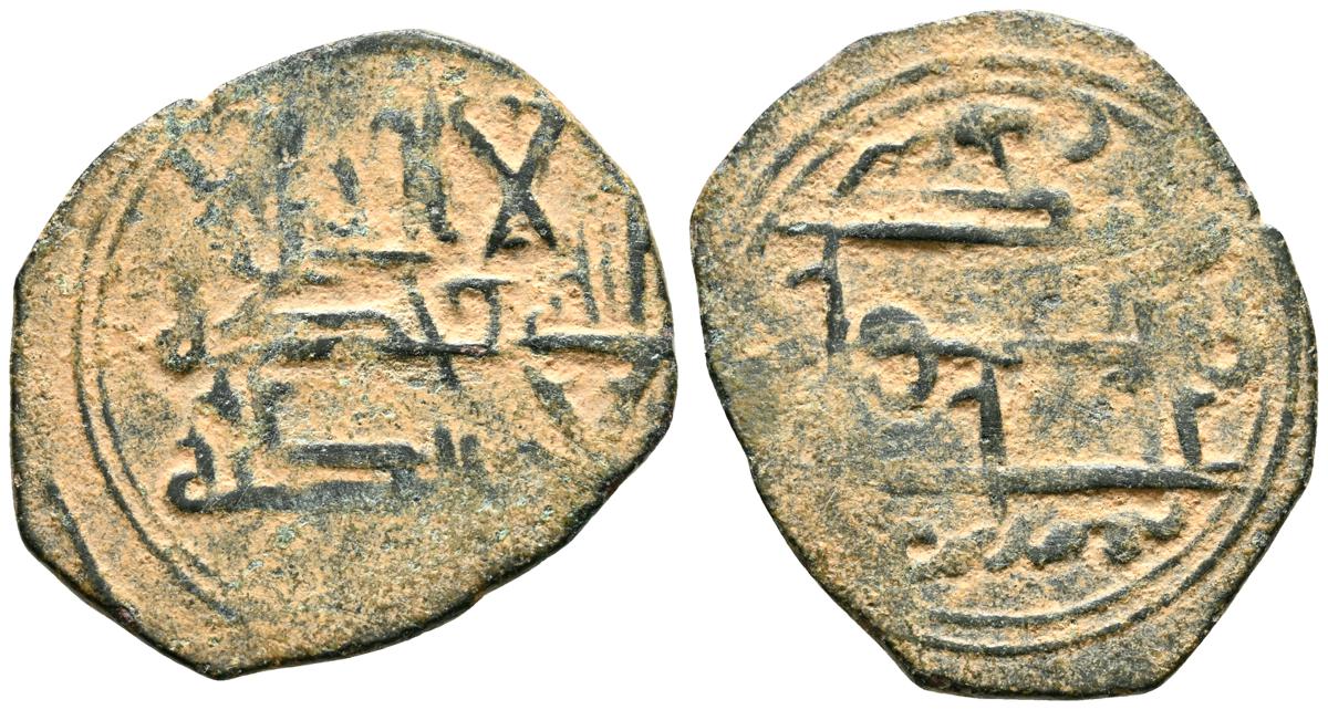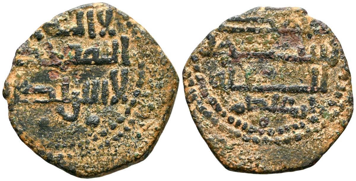 EMIRATO INDEPENDIENTE DE CÓRDOBA, atribuída a Abd Allah (275-300H). Felús. (Ae. 1,82g/19mm). S/D. (Vives 332; Frochoso I-69/70). Anv: 'Sahada' en tres líneas rodeada de doble gráfila circular de puntos. Rev: Misión profética de Muhammad entres líneas , citando a Husain Ibn Isam / بن عاصم / حسين, todo dentro de doble gráfila circular de puntos. MBC/BC+. Muy raro ejemplar.