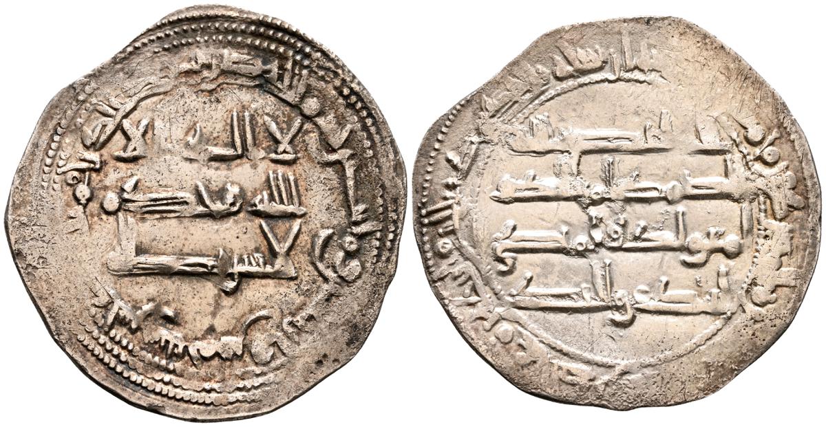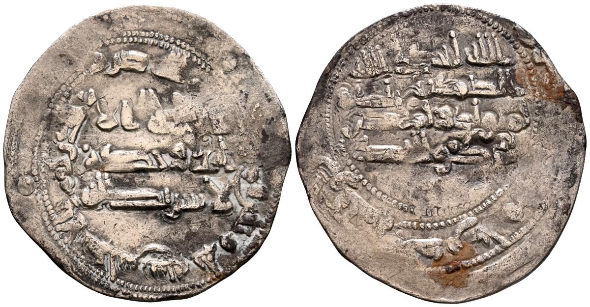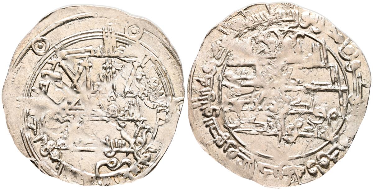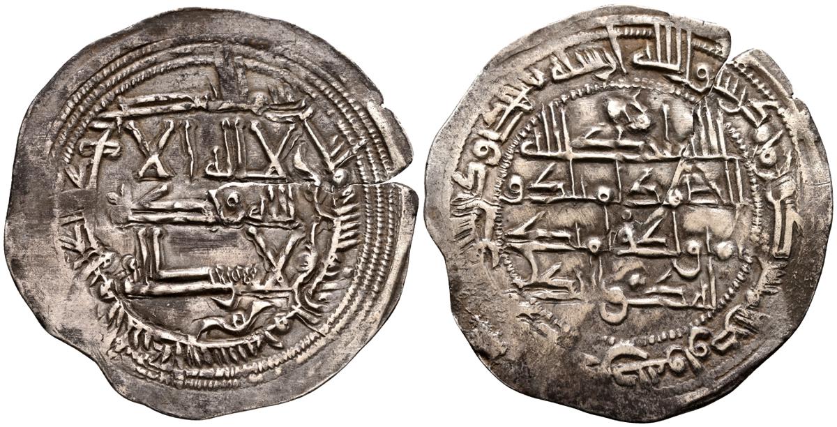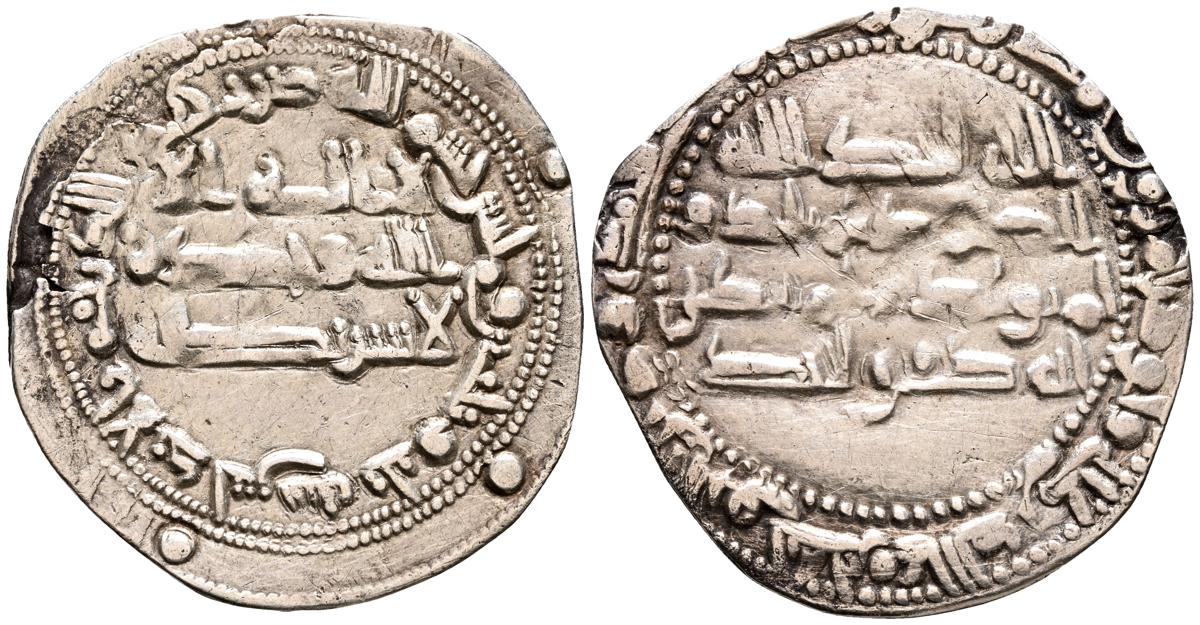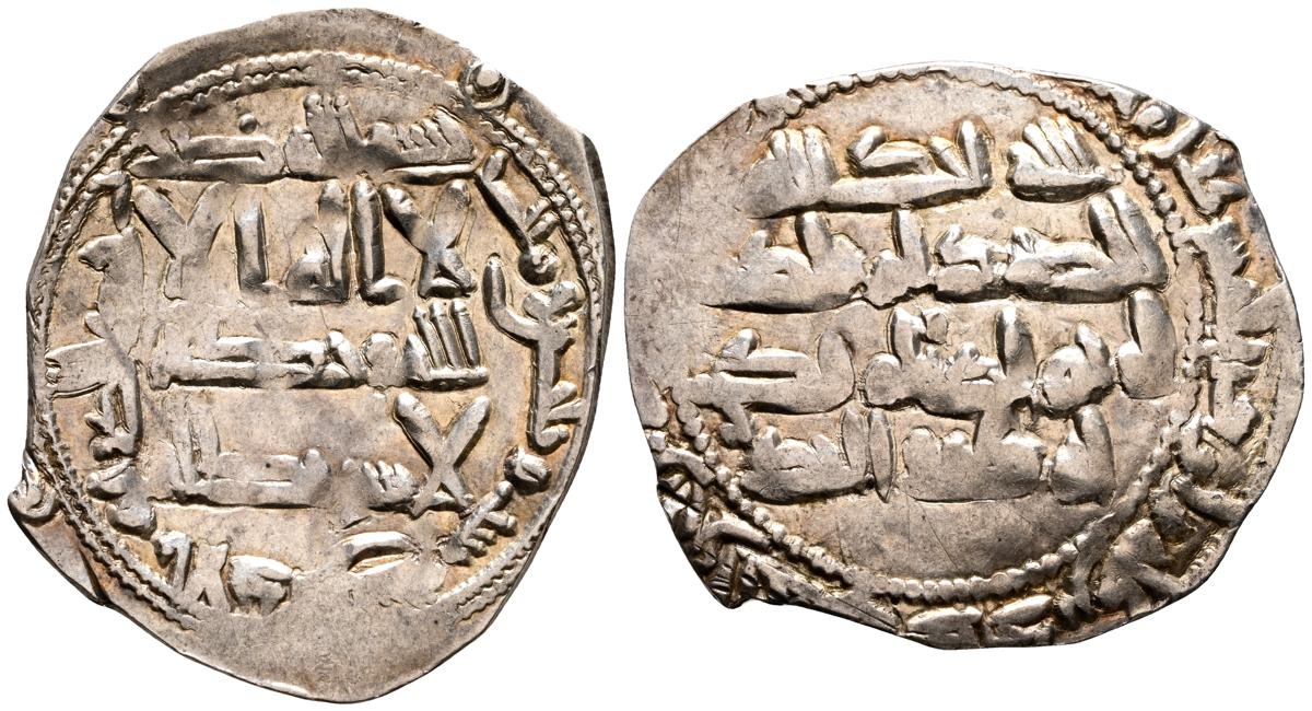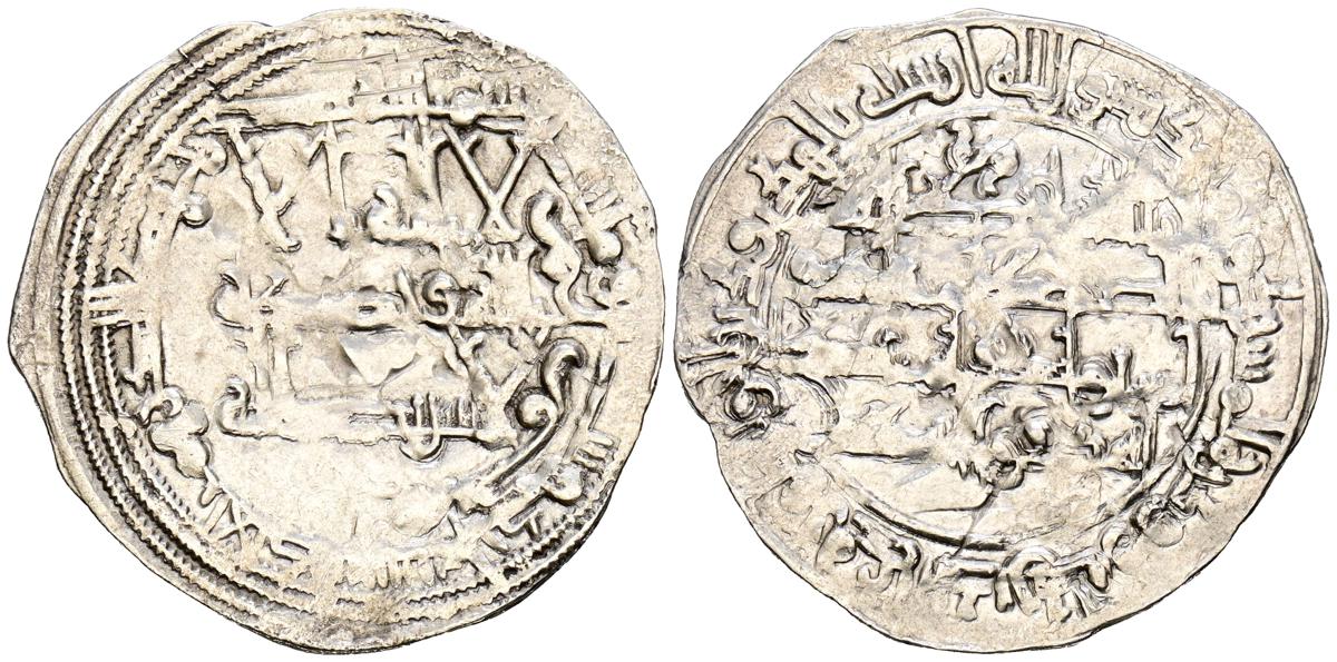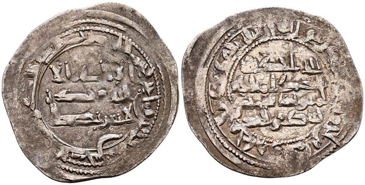 EMIRATO INDEPENDIENTE DE CÓRDOBA, atribuída a Abd Allah (275-300H). Felús. (Ae. 1,82g/19mm). S/D. (Vives 332; Frochoso I-69/70). Anv: 'Sahada' en tres líneas rodeada de doble gráfila circular de puntos. Rev: Misión profética de Muhammad entres líneas , citando a Husain Ibn Isam / بن عاصم / حسين, todo dentro de doble gráfila circular de puntos. MBC/BC+. Muy raro ejemplar.