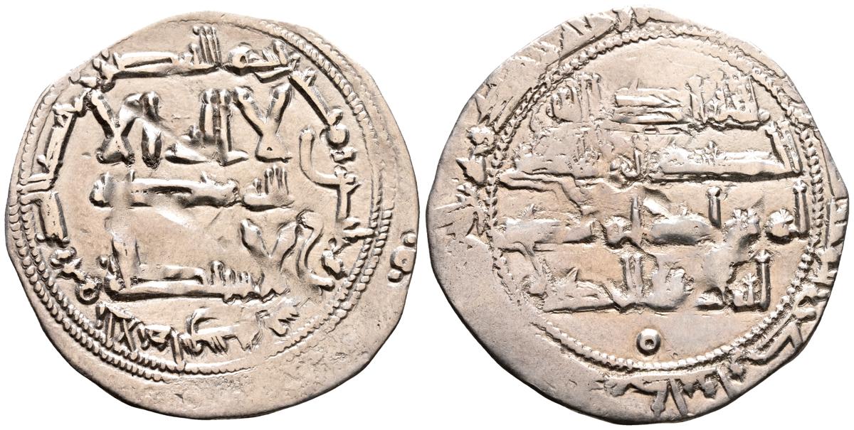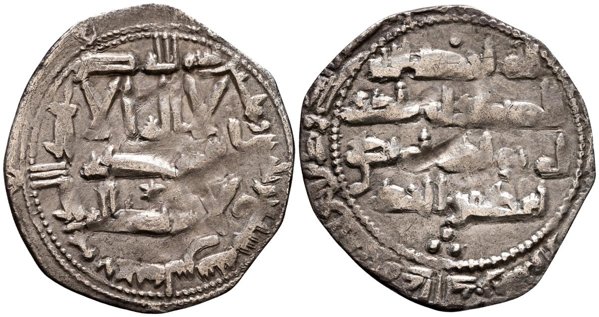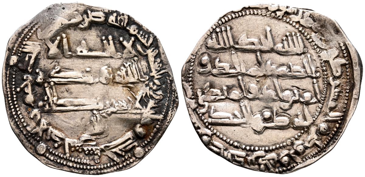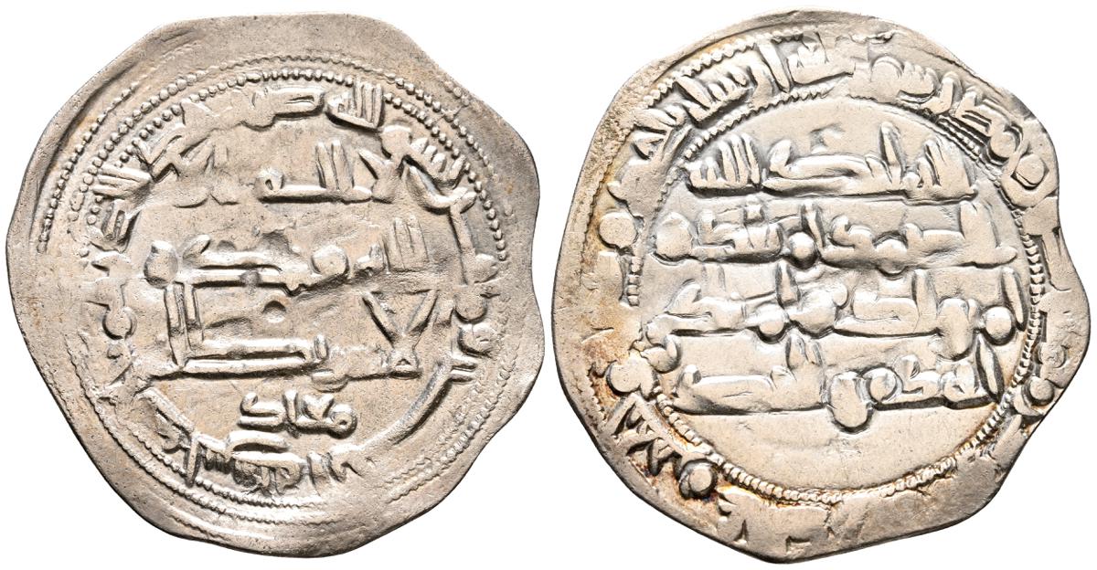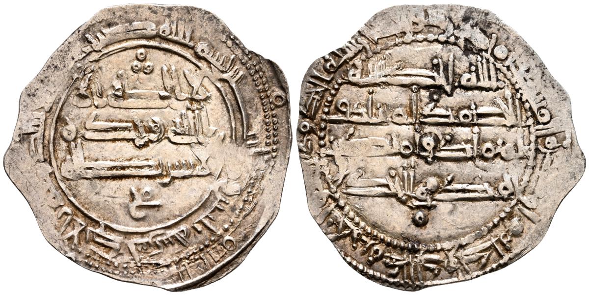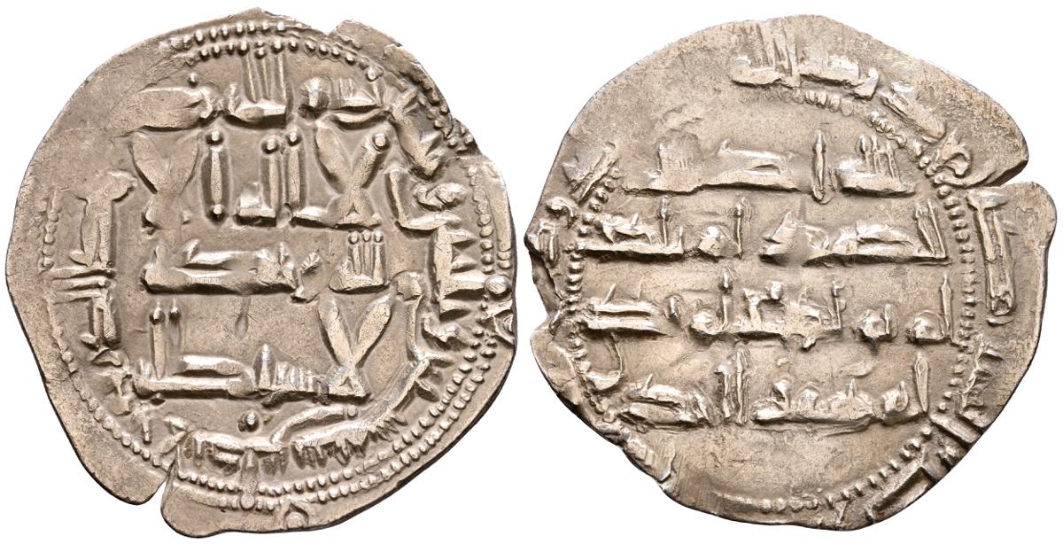 EMIRATO INDEPENDIENTE DE CORDOBA, Abd al-Rahman II. Dirham. (Ar. 1,61g/23mm). 230H. al-Ándalus / الاندلس. (Vives 195; Frochoso no cita esta combinación de adornos). MBC. Porosidad. Incluye etiqueta con anotaciones de época del antiguo coleccionista.