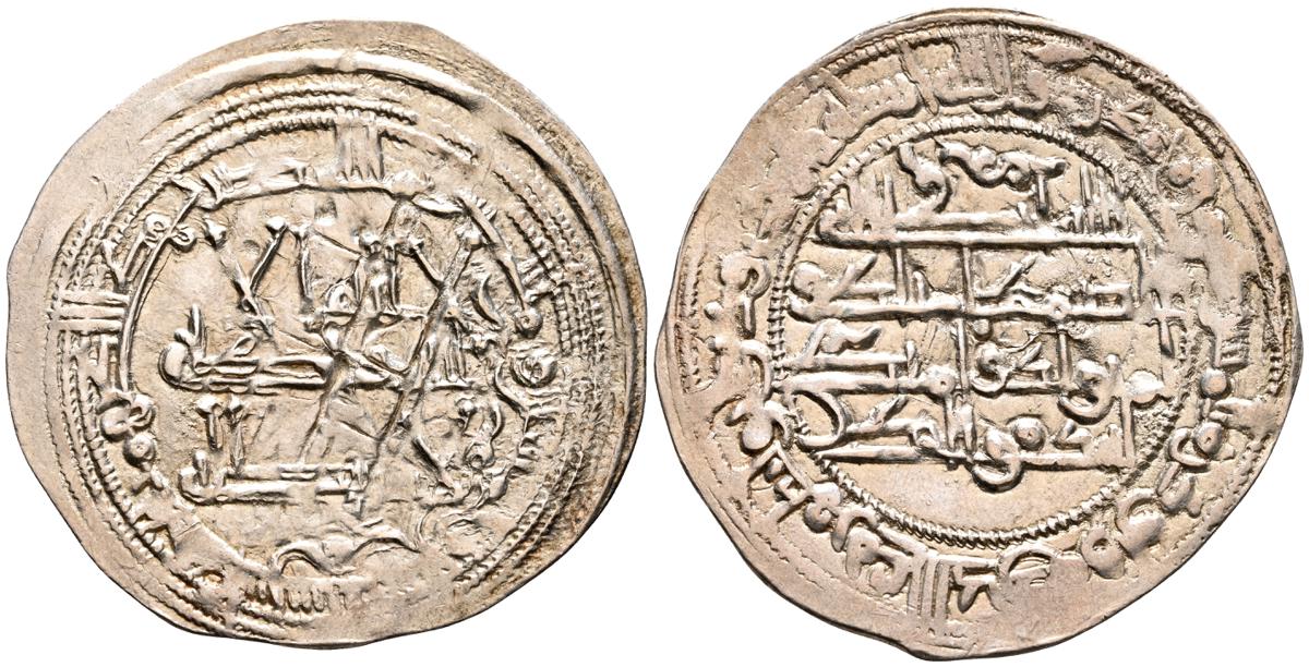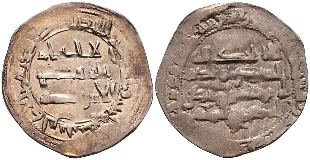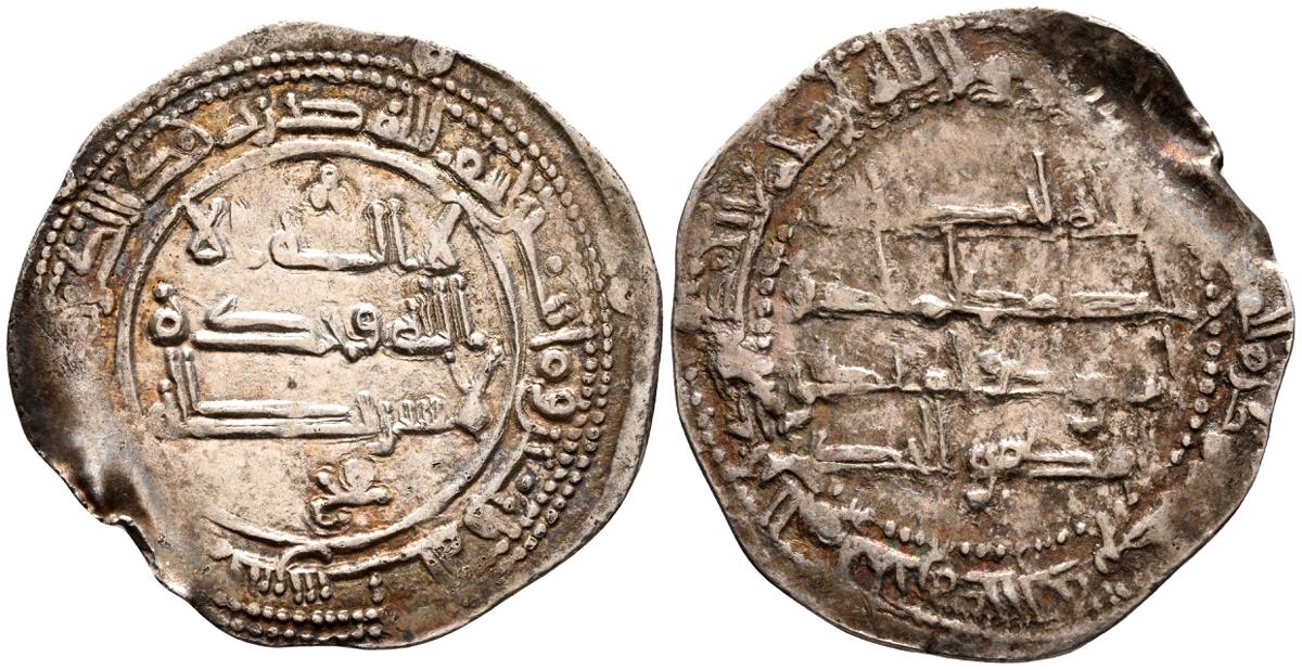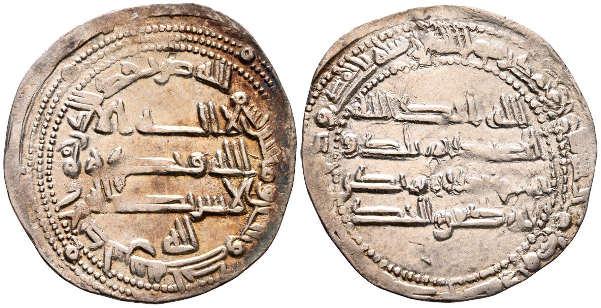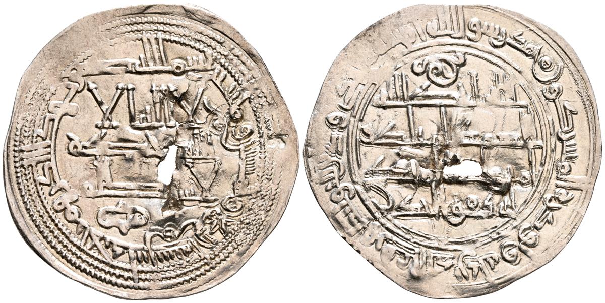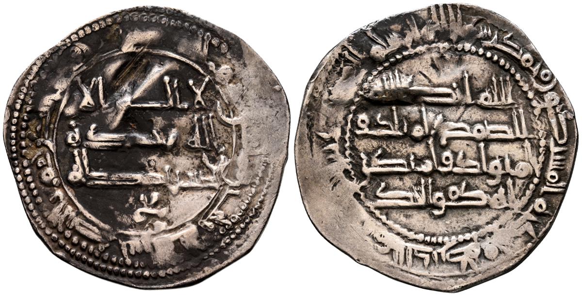 EMIRATO INDEPENDIENTE DE CORDOBA, Abd al-Rahman II. Dirham. (Ar. 1,61g/23mm). 230H. al-Ándalus / الاندلس. (Vives 195; Frochoso no cita esta combinación de adornos). MBC. Porosidad. Incluye etiqueta con anotaciones de época del antiguo coleccionista.