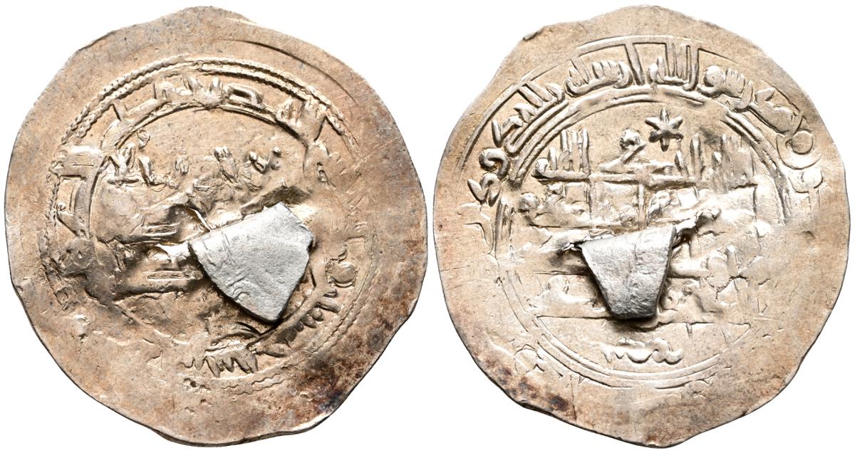 EMIRATO INDEPENDIENTE DE CORDOBA, Muhammad I. Dirham. (Ar. 2,79g/29mm). 250H. al-Ándalus / الاندلس. (Vives 261; Frochoso 250.19). Cuarta acuñación. MBC-. Perforación con añadido de compensación de peso.