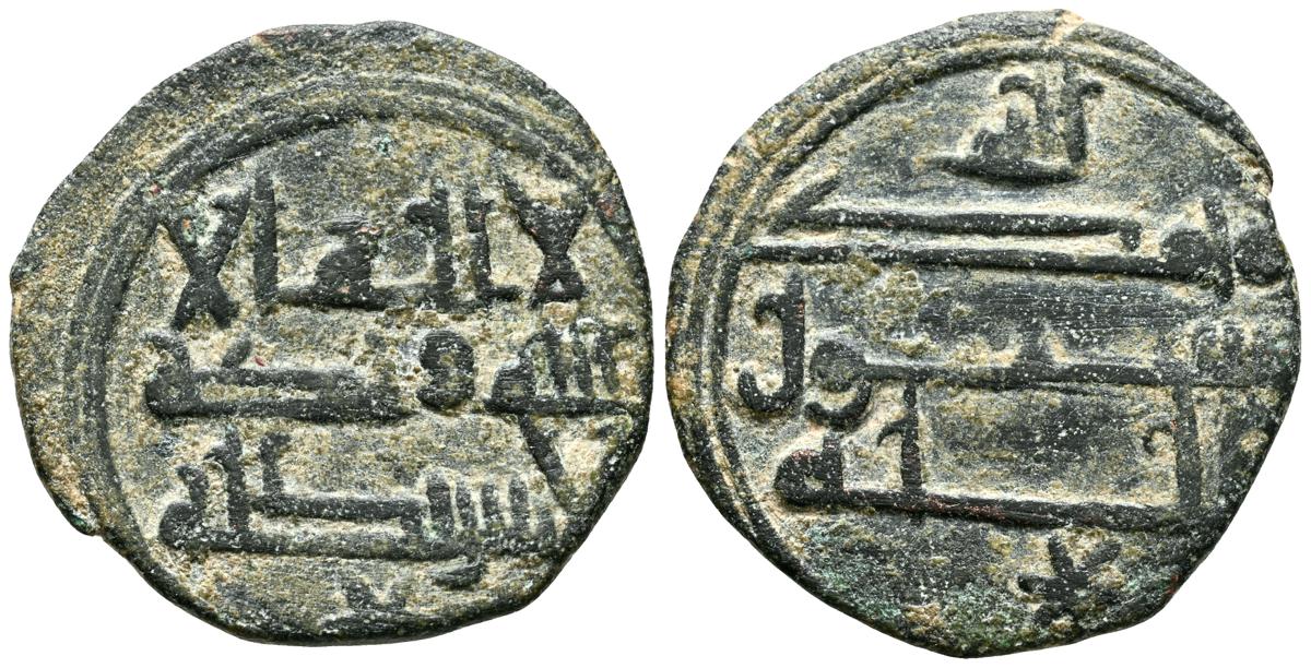 EMIRATO INDEPENDIENTE DE CÓRDOBA. Mas'ud ibn 'Ali (Gobernador de Pechina desde el año 302H). Felús. (Ae. 1,51g/17mm). S/D. (Vives 337; Frochoso I-74). Anv: 'Sahada' en tres líneas rodeada gráfila circular de puntos. Rev: Misión profética de Muhammad en tres línes. Citando arriba: غلب (Galaba) y abajo: مسعودابن على (Mas'ud ibn 'Ali). MBC-. Muy raro ejemplar.