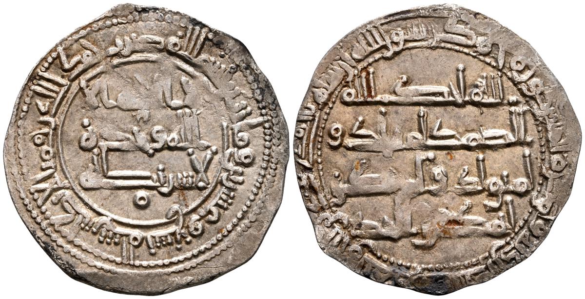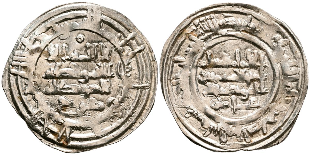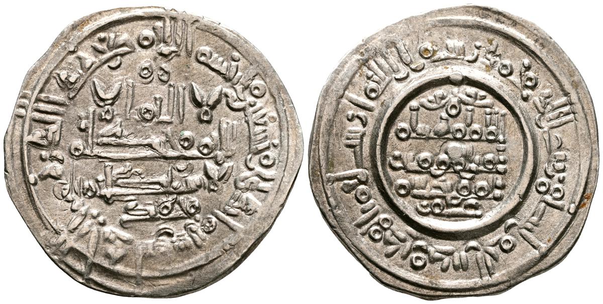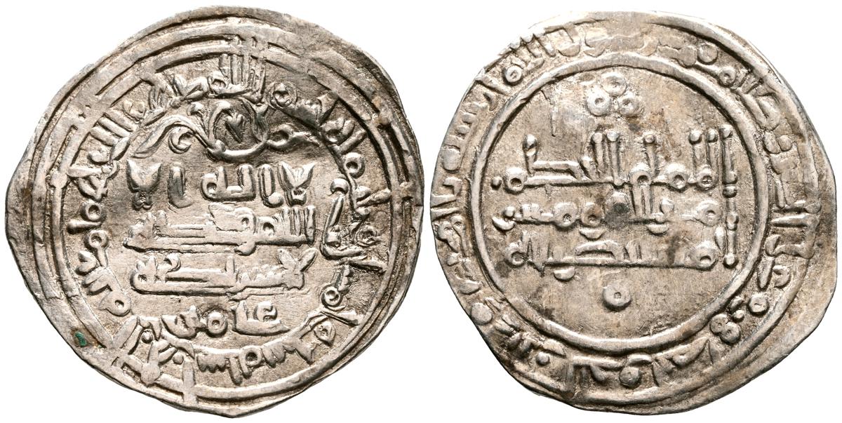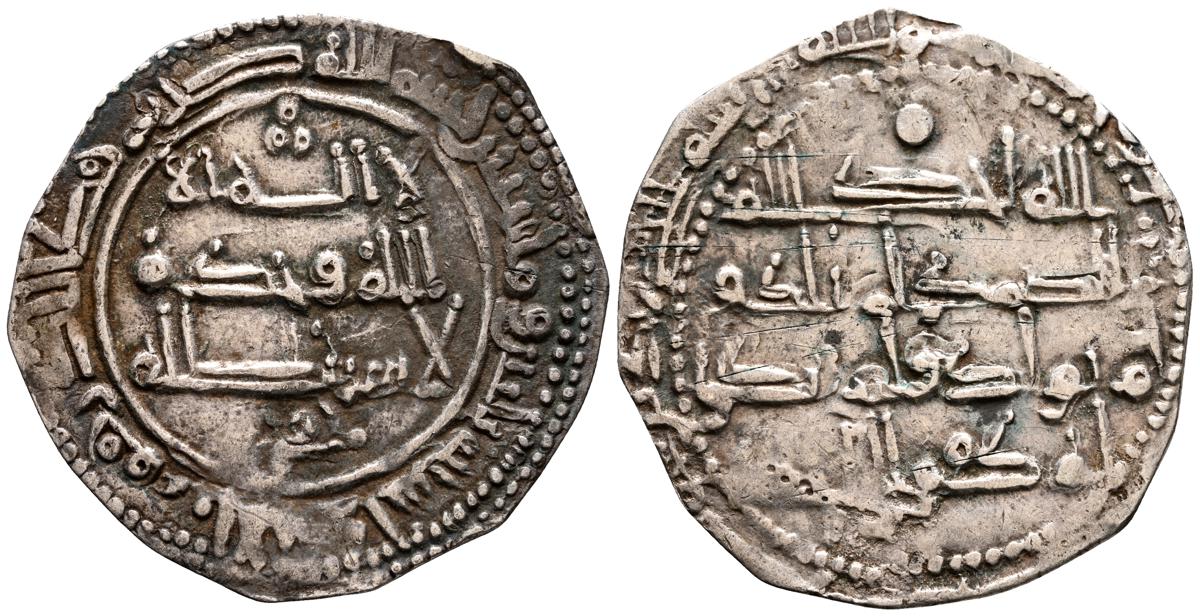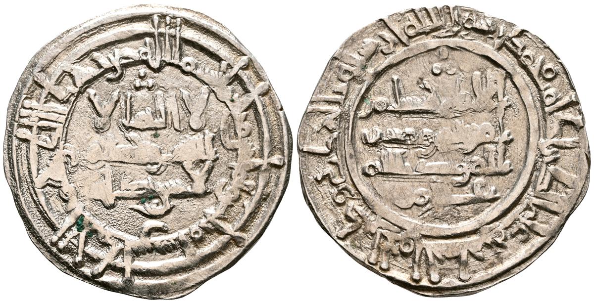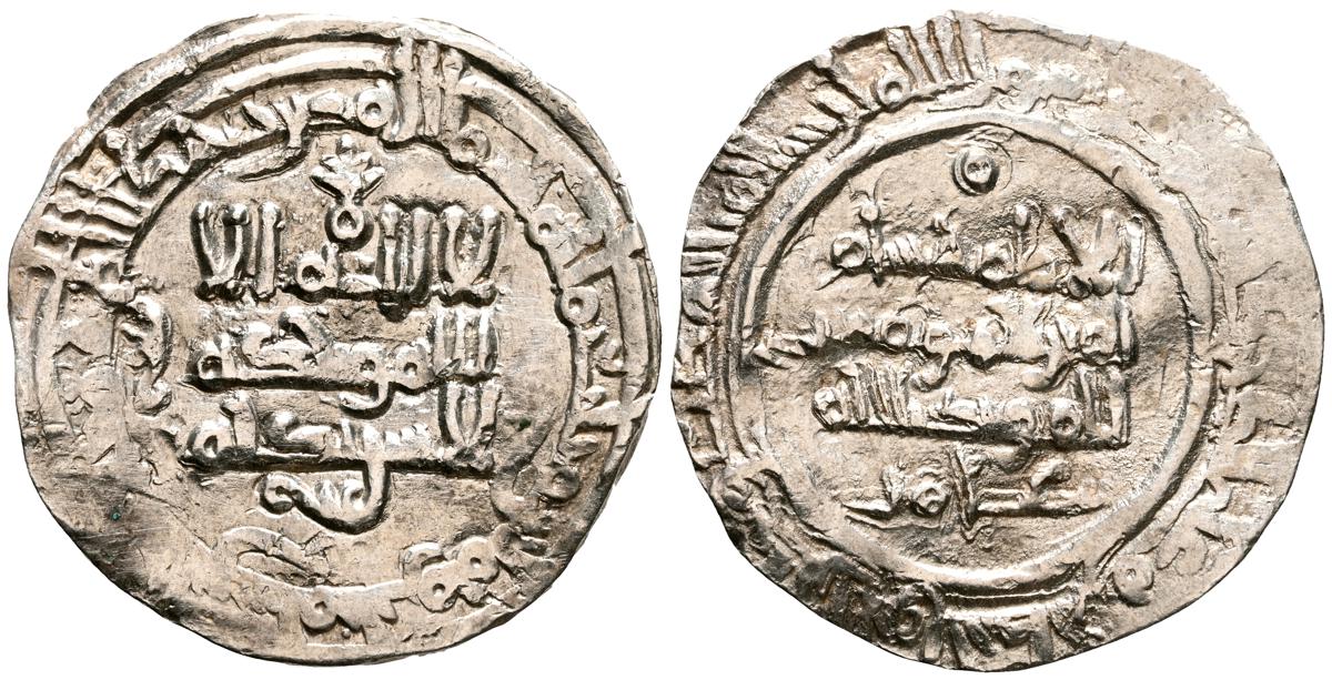 EMIRATO INDEPENDIENTE DE CORDOBA, Abd al-Rahman II. Dirham. (Ar. 2,68g/26mm). 229H. al-Ándalus / الاندلس. (Vives 187; Frochoso no cita esta combinación de adornos). EBC+. Vano de acuñación. Leve tono de monetario.