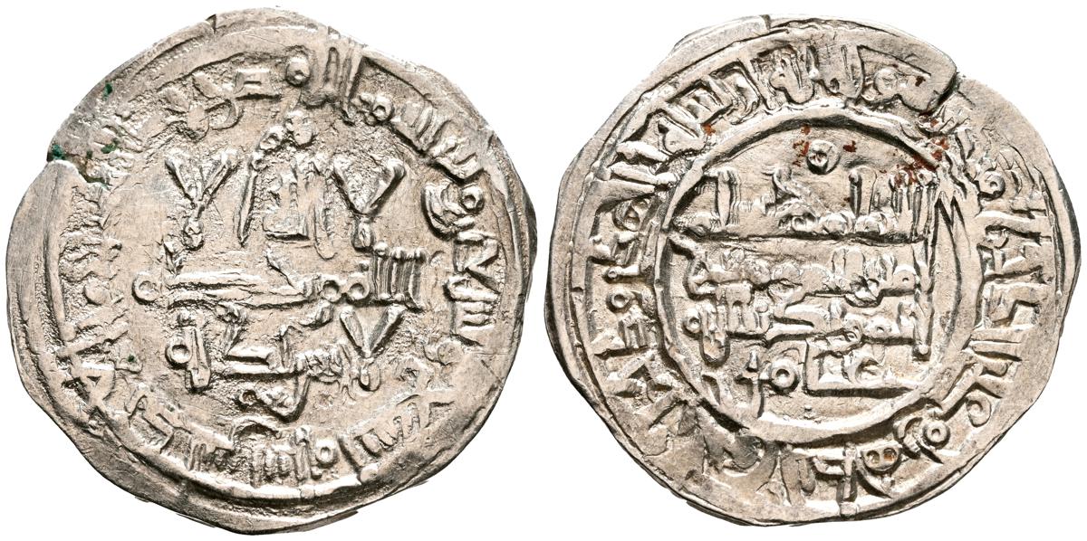 EMIRATO INDEPENDIENTE DE CORDOBA, Abd al-Rahman II. Dirham. (Ar. 2,03g/23mm). 229H. al-Ándalus / الاندلس. (Vives 189; Frochoso 229.11). Segunda emisión. MBC-. Grieta. Incluye etiqueta con anotaciones y dibujos de época del antiguo coleccionista.