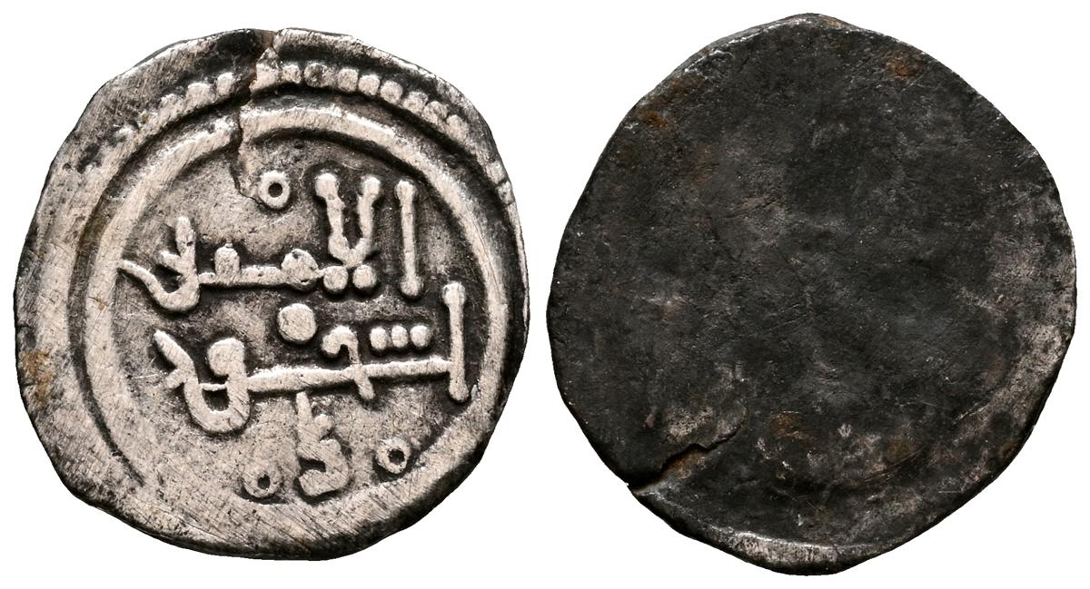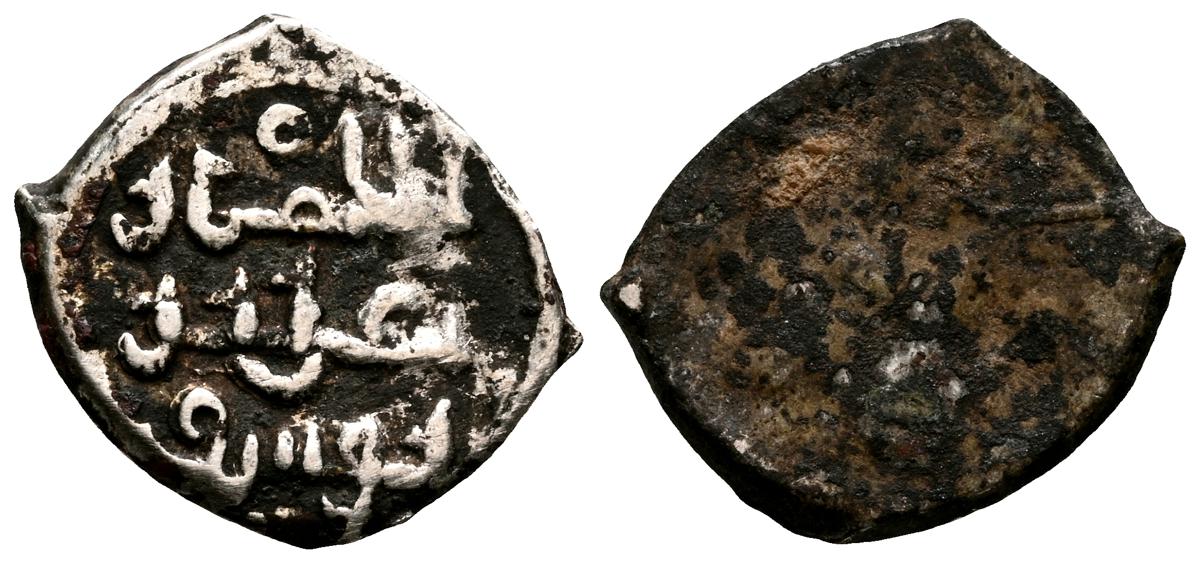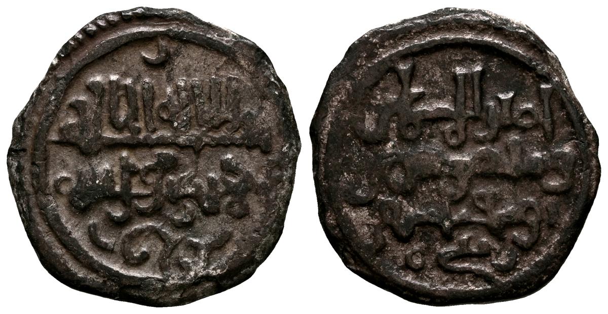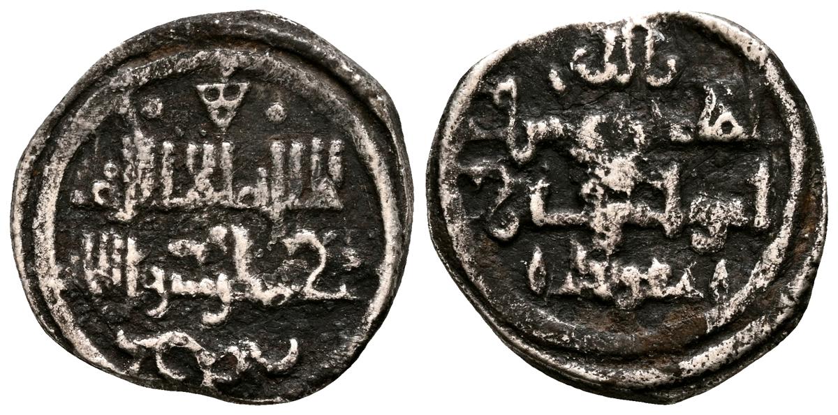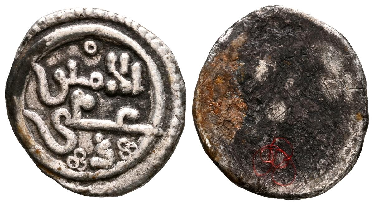 ALMORAVIDES. Ali ben Yusuf y el Emir Sir (522-533H.). Quirate. (Ar. 0,55g/12mm). S/D. (Vives no cita; Eustache 341A (lectura parcial); Benito Cf12). Anv: Shahada' en tres líneas y mención al heredero: الامير سير. Rev: En el centro: الله/ حسبي (Dios m e basta), alrededor se presenta a Ali con los títulos de Amir al-Muslimin y Nasir al-Din. MBC. Pátina oscura. Muy raro ejemplar.