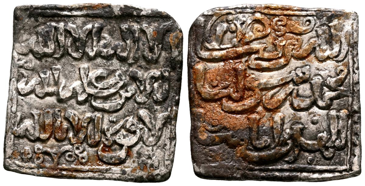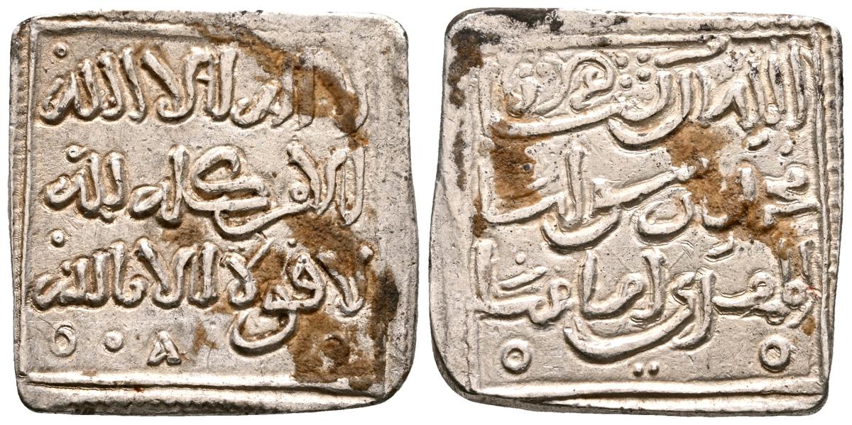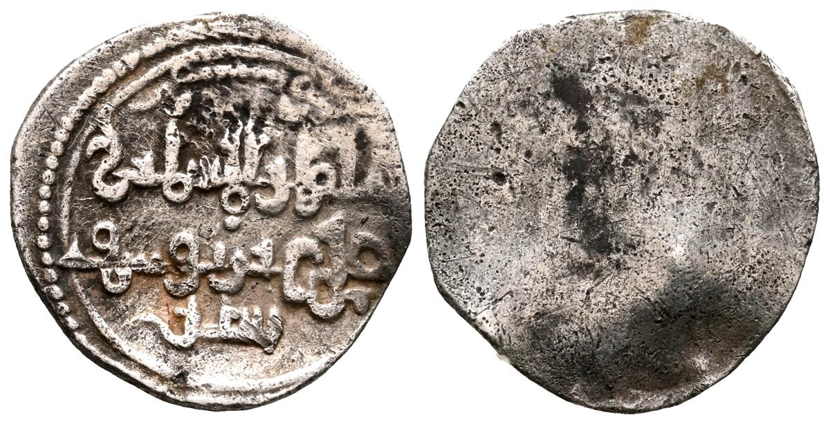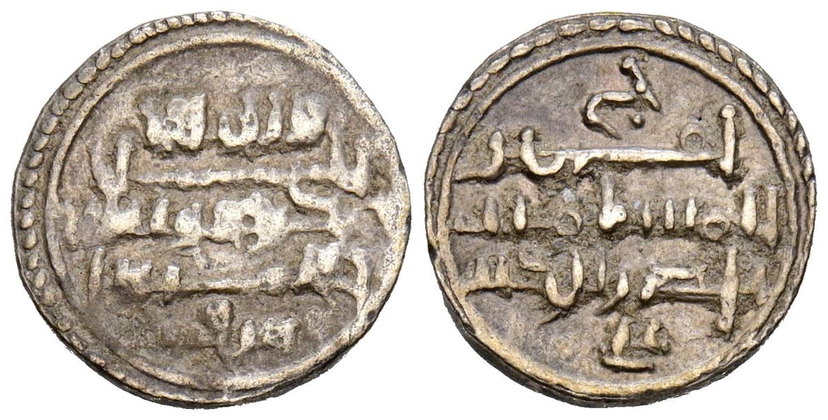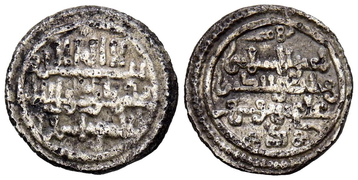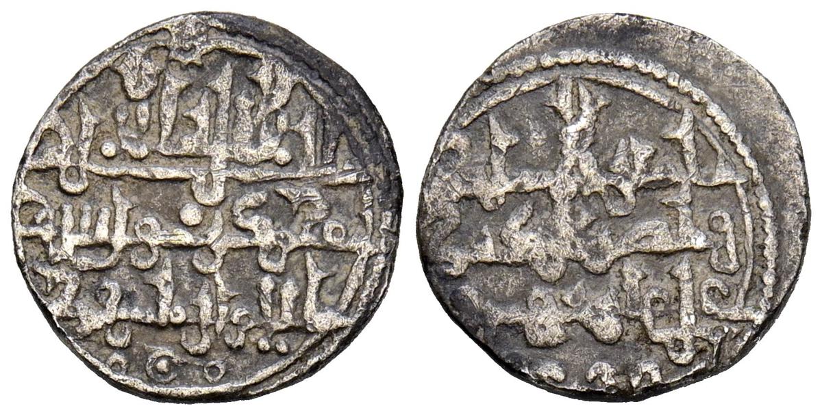 ALMORAVIDES. Ali ben Yusuf y el Emir Sir (522-533H.). Quirate. (Ar. 0,55g/12mm). S/D. (Vives no cita; Eustache 341A (lectura parcial); Benito Cf12). Anv: Shahada' en tres líneas y mención al heredero: الامير سير. Rev: En el centro: الله/ حسبي (Dios m e basta), alrededor se presenta a Ali con los títulos de Amir al-Muslimin y Nasir al-Din. MBC. Pátina oscura. Muy raro ejemplar.