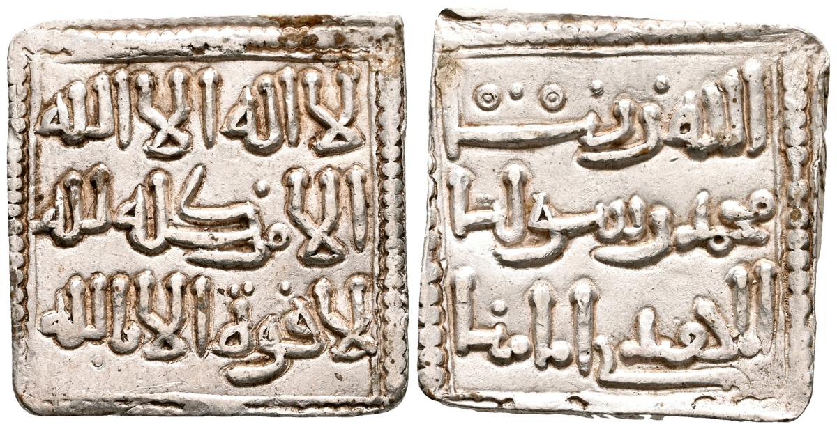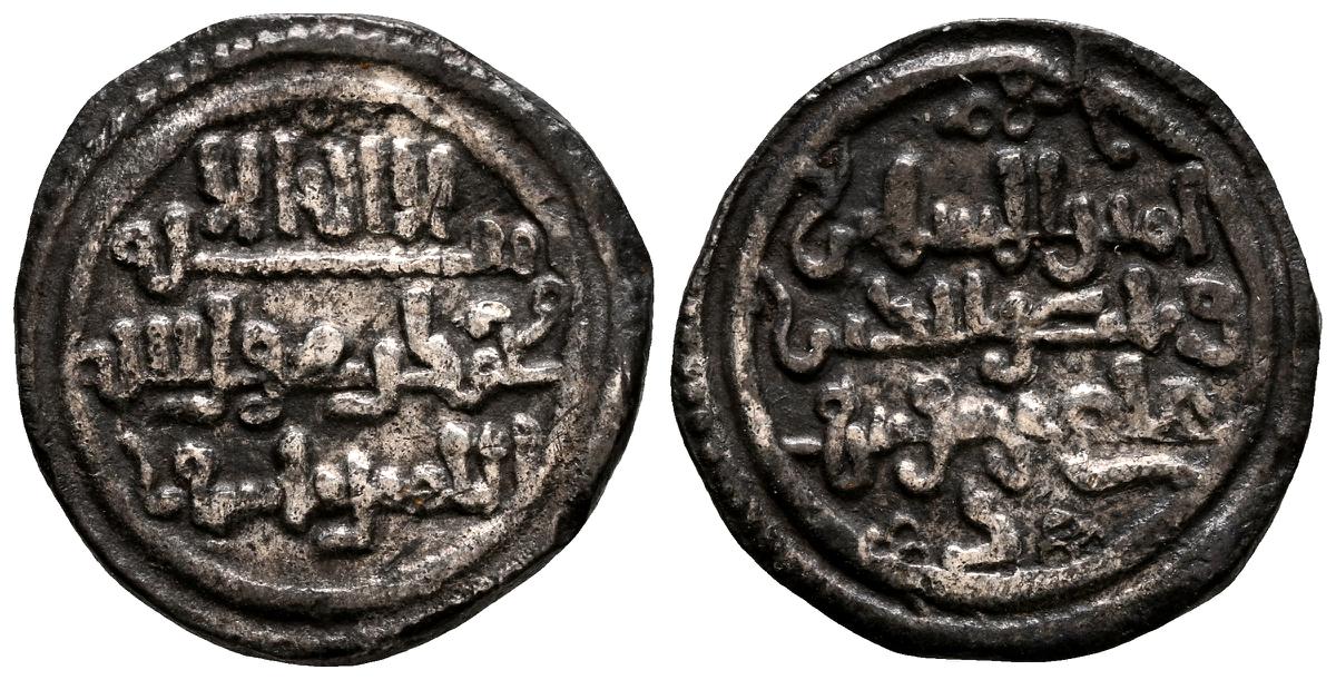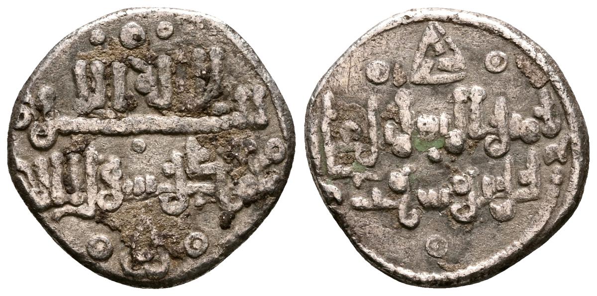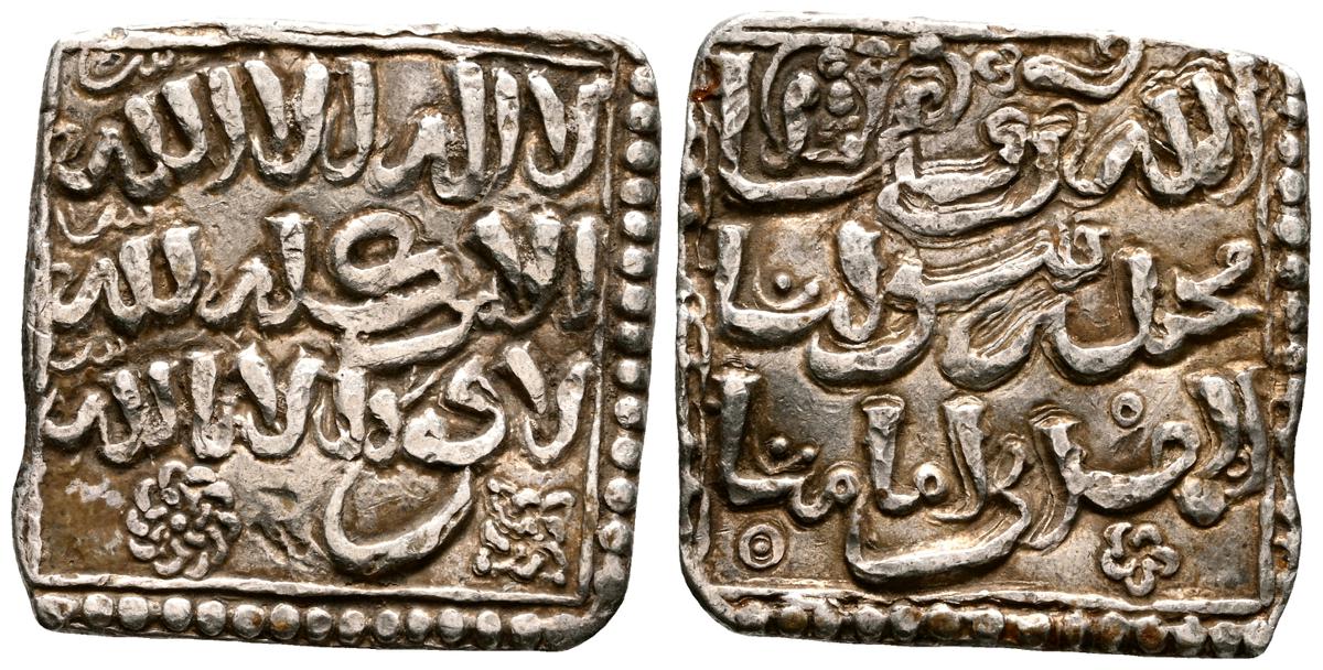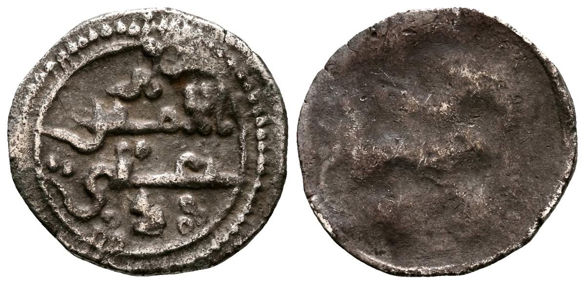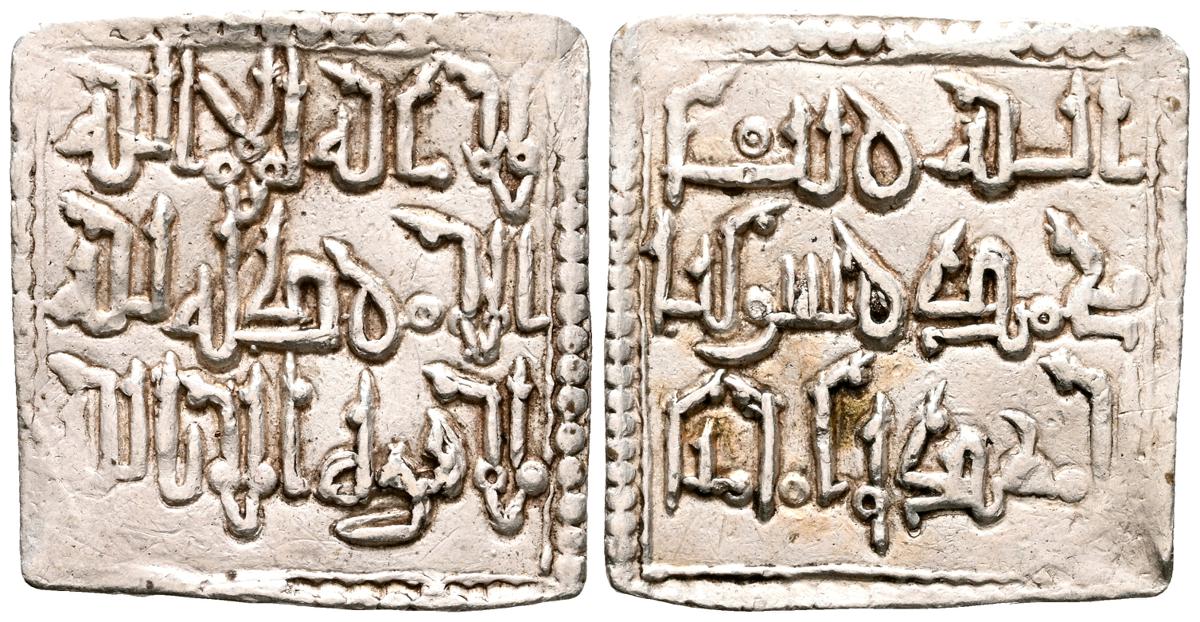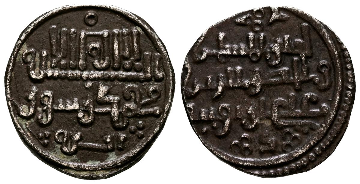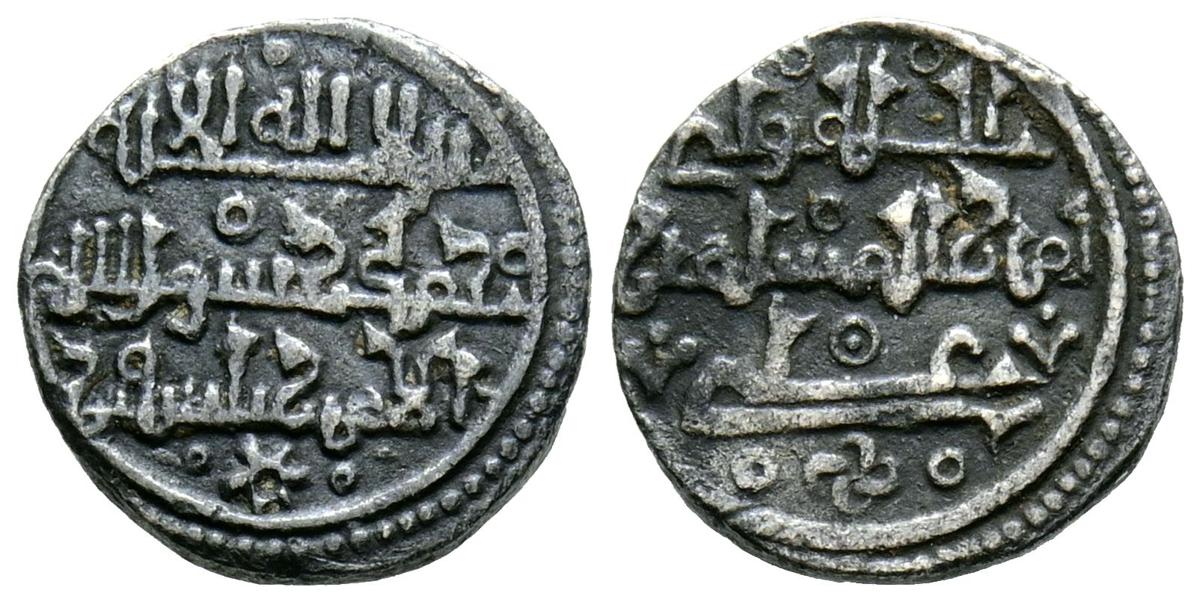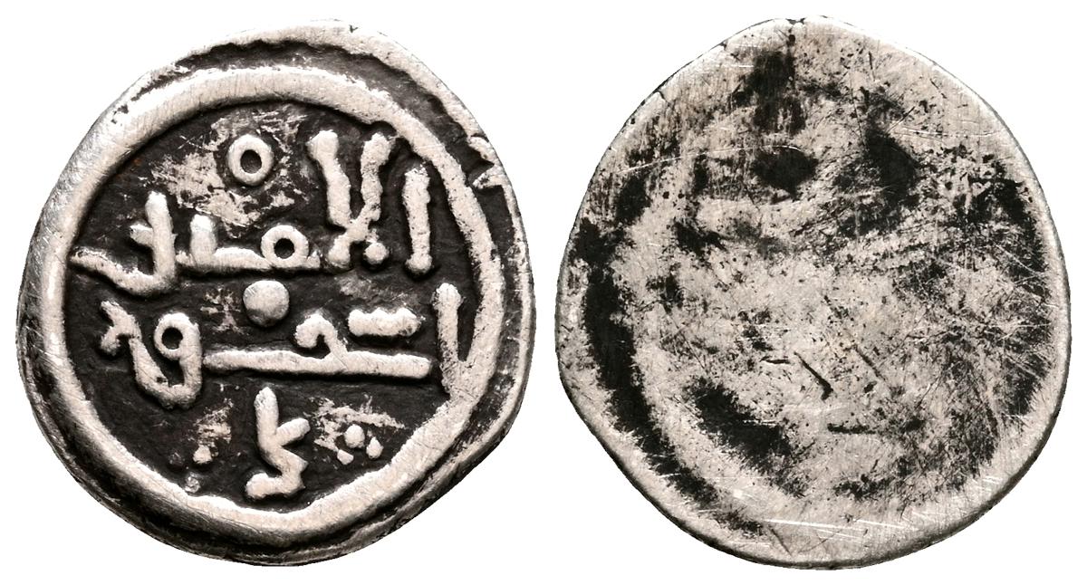ALMOHADES, Anónima citando a Al-Mahdi. Dirham. (Ar. 1,47g/14mm). S/D. (Tipos Vives 2088; Medina 201.a; Hohertz 578). Interesante ejemplar que contiene decoración de puntos y una curiosa y diminuta letra ''gayn'', en el lugar de ceca en ambas areas. E BC-.