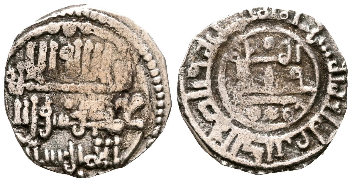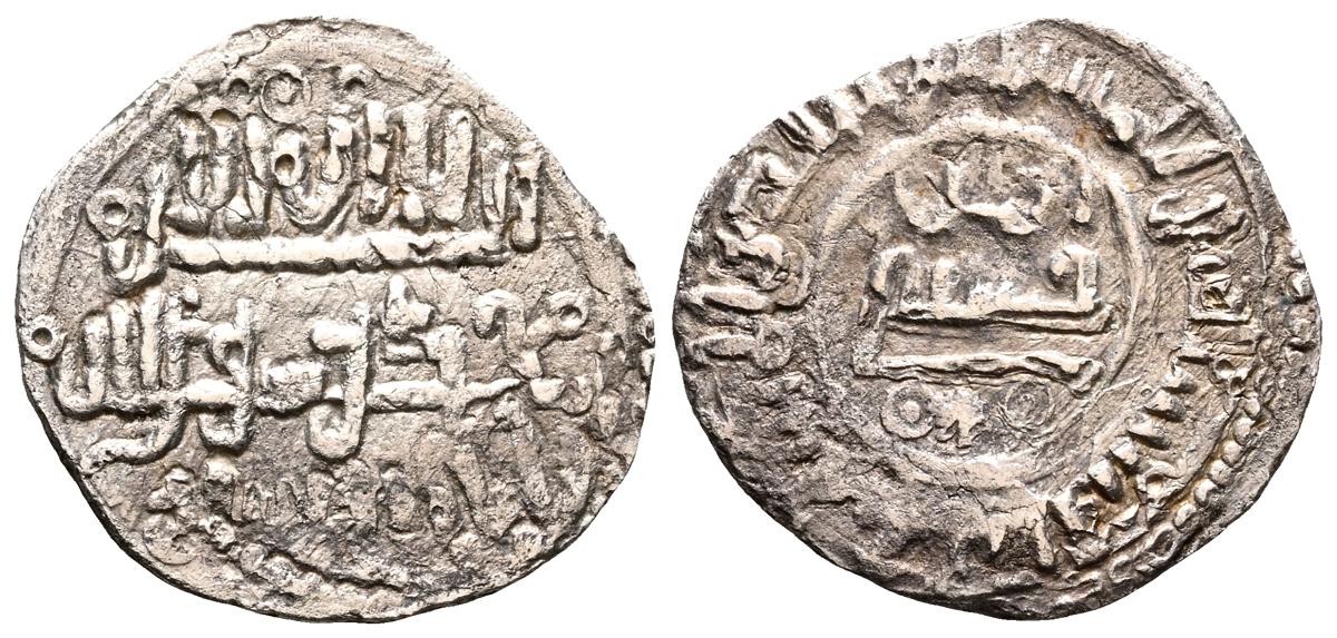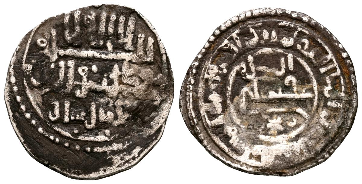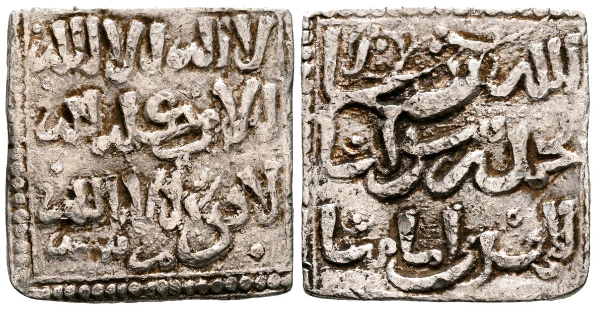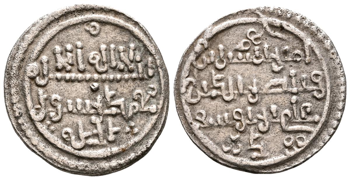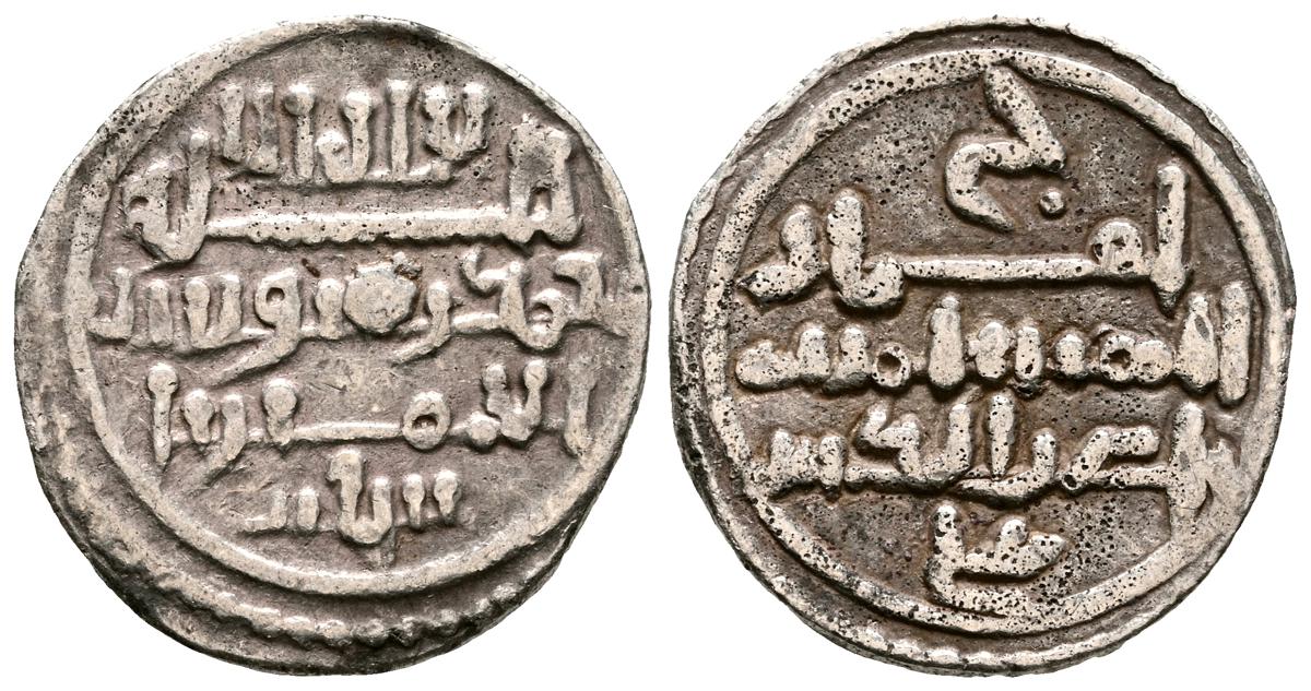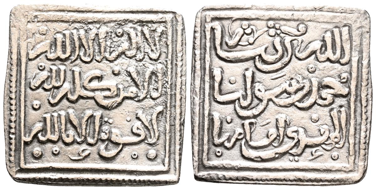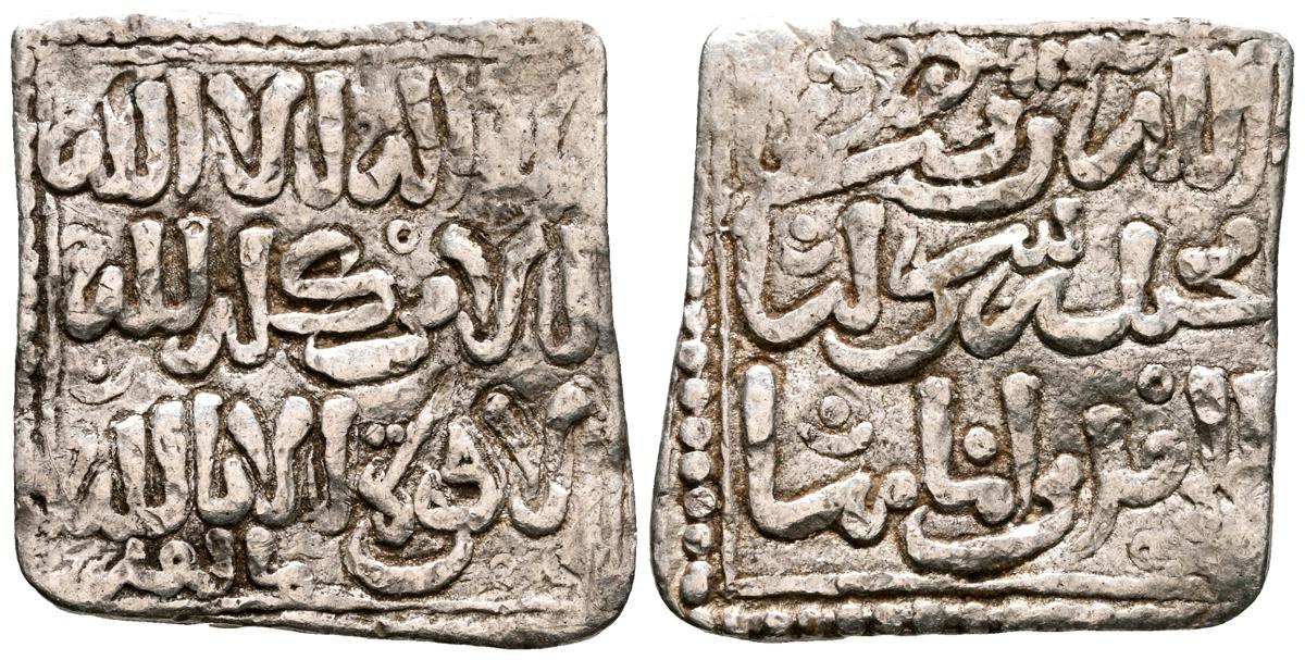 ALMOHADES, Anónima citando a Al-Mahdi. Dirham. (Ar. 1,47g/14mm). S/D. (Tipos Vives 2088; Medina 201.a; Hohertz 578). Interesante ejemplar que contiene decoración de puntos y una curiosa y diminuta letra ''gayn'', en el lugar de ceca en ambas areas. E BC-.