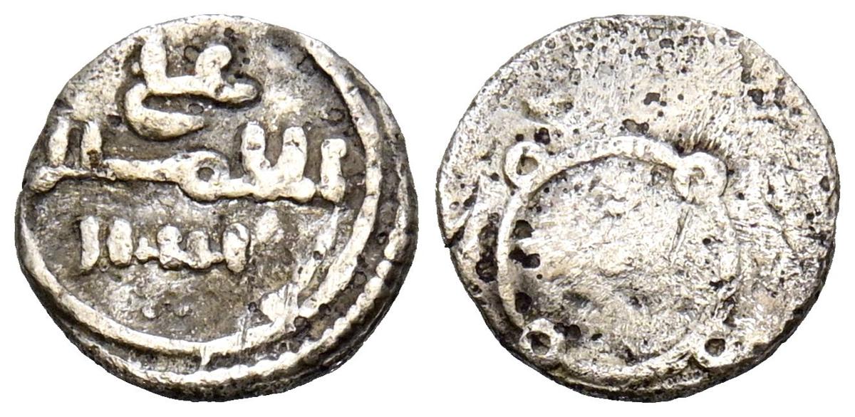 ALMORAVIDES. Ali ben Yusuf y el Emir Sir (522-533H). Quirate. (Ar. 0,31g/11mm). S/D. (Vives no cita; Eustache 341A (lectura parcial); Benito Cf12). Anv: Shahada' en tres líneas y mención al heredero: الامير سير. Rev: En el centro: الله/ حسبي (Dios me basta), alrededor se presenta a Ali con los títulos de Amir al-Muslimin y Nasir al-Din. MBC/MBC+. Muy raro ejemplar.