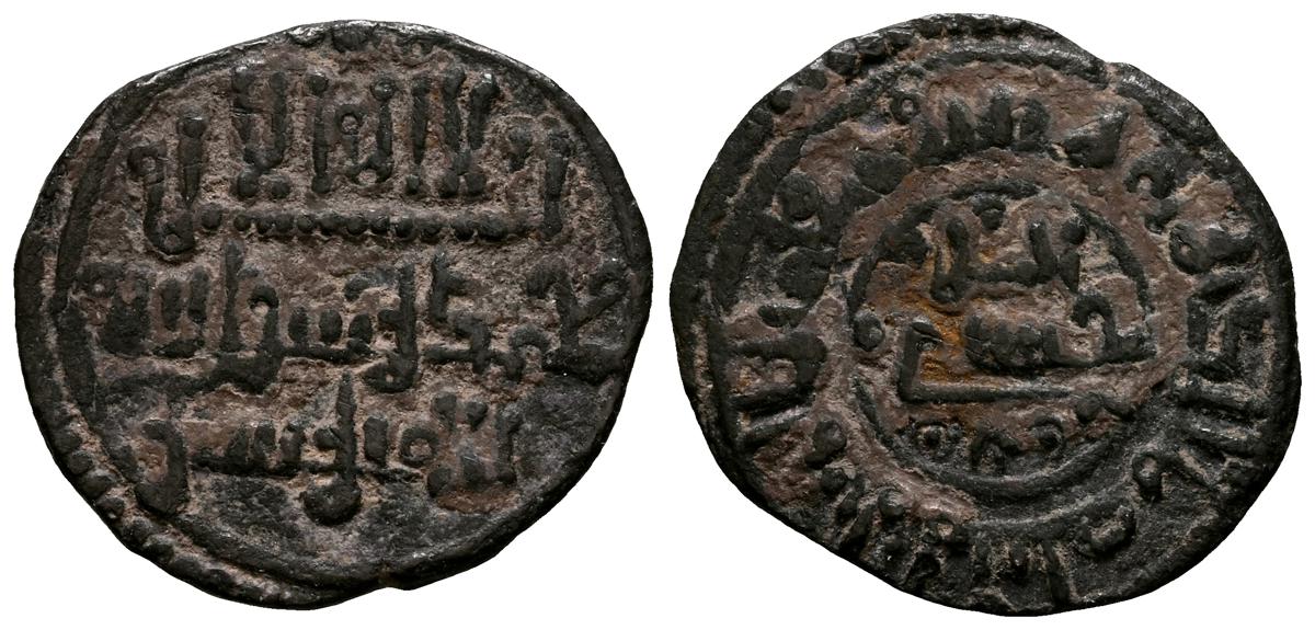 ALMORAVIDES, Yusuf ben Tashfin (480-500H). Quirate de cobre. (Ae. 0,95g/12mm). S/D. (Vives no cita; Martínez 2; Eustache 84; Benito Ba16). Anv: 'Shahadah' en cuatro líneas. Rev: Presenta a Yusuf con el título de al-Musta'in bi-Allah arriba divido en dos lines: المستعين / بالله. MBC-. Cospel irregular. Rara. Este tipo de Yusuf junto con algunas variantes de Quirate de Ali, son los únicos tipos de todo el periodo almorávide que contiene el título de al-Musta'in bi-Allah ("el que pide la ayuda de D ios").