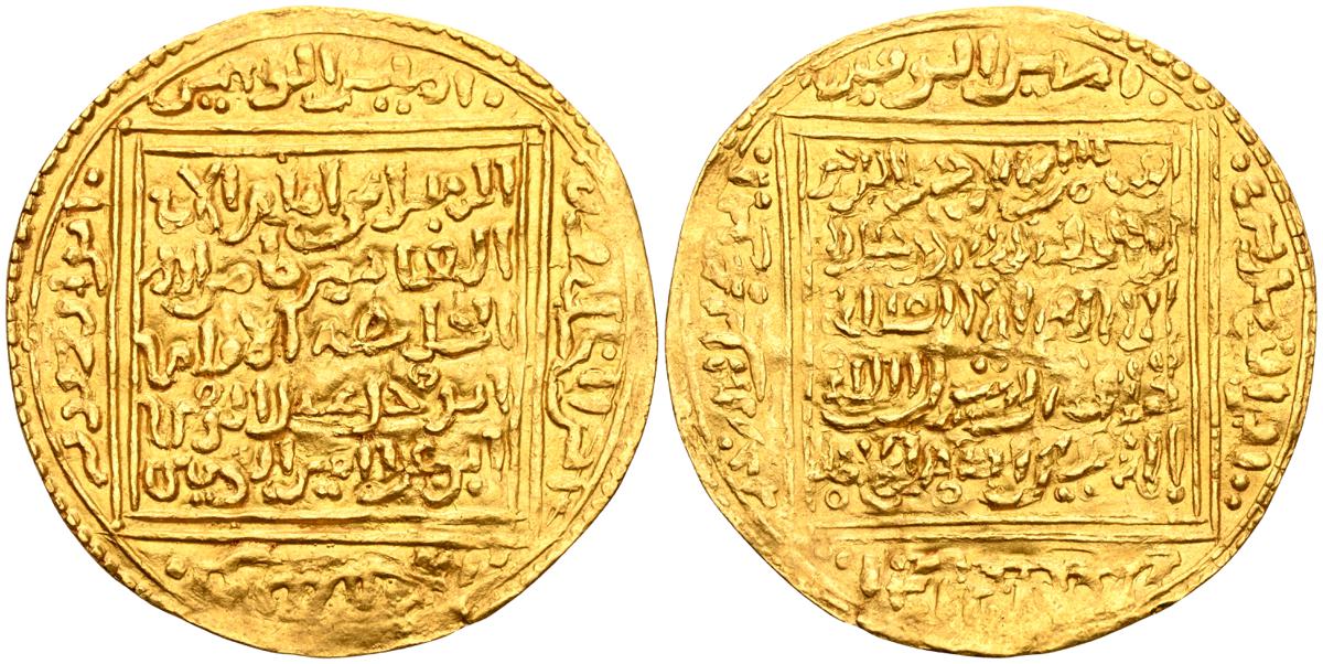 ALMOHADES, Muhammad al-Nasir. Dinar. (Au. 4,42g/31mm). 598-610H. (Vives 2074; Hazard H3 (pág. 231); Medina 178). Dinar híbrido, con anverso de Muhammmad (Vives 2073) y reverso de Abu Hafs Umar (Vives 2079). EBC-. Muy raro, tenemos constancia de solo 2 ejemplares más, subastados por Aureo & Calicó, en los ultimos 20 años, uno de ellos ofrecido en la colección Caballero de las Yndias, Subasta 218-3 (22/10/2009), Nº Lote 1457 y el otro ofrecido en la subasta selección de 2022, Subasta 387 (17/03/2022), Nº Lote 30, ambos rematados en 1700€ más su respectiva comisión.