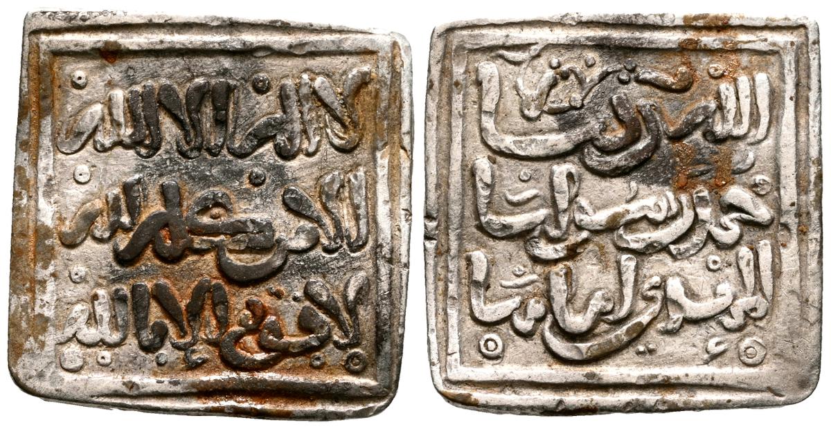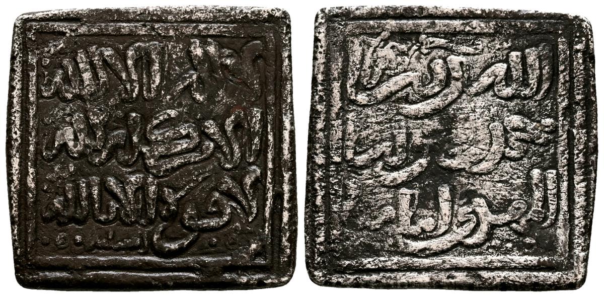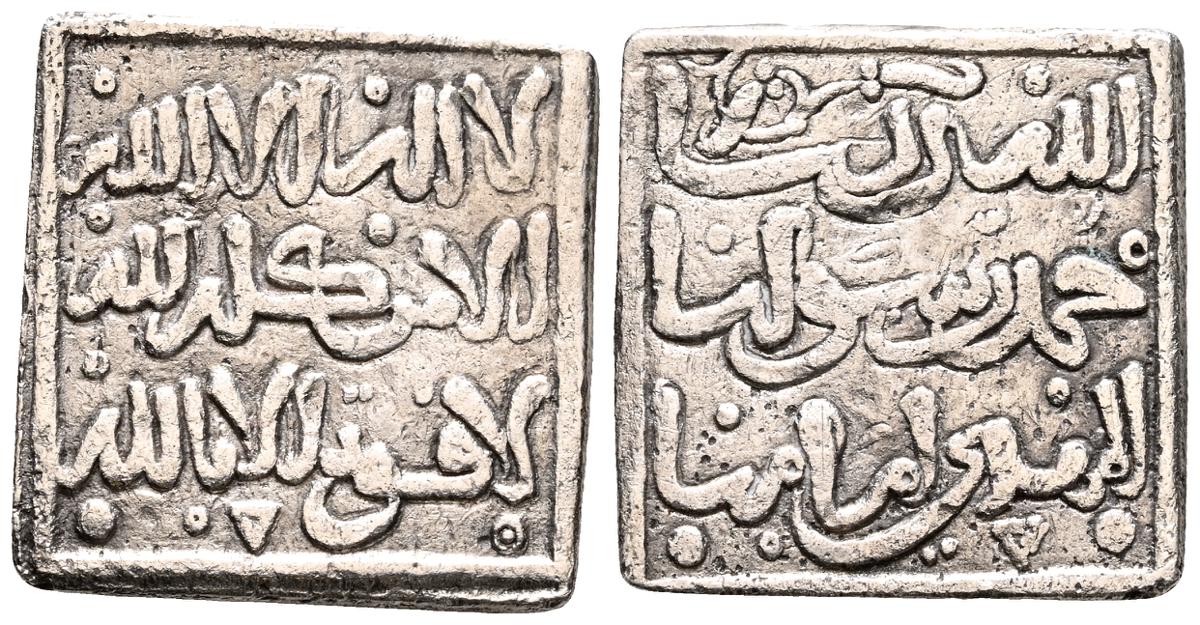 ALMOHADES, Anónimo a nombre de Al-Mahdí. Dirham. (Ar. 1,54g/16mm). S/D. (Hazard 1123 var; Hohertz 617). MBC+. Vanos. Escaso y muy bello ejemplar. Esta pieza presenta una caligrafía cúfica ornamental muy llamativa al estilo Hafsí y similar a las moned as atribuídas a Abu Hafs 'Umar al-Murtada con ceca 'Al-Hadrat al-Muminiya al-Murtadiya' (Hohertz 563). Por tanto, posiblemente fue acuñada en la misma época por algún gobernador de la zona.