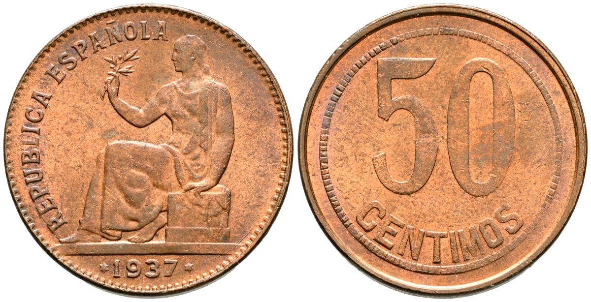 II REPÚBLICA (1931-1939). 50 Céntimos. (Ae. 5,97g/23mm). 1937 *3-6. (Cal-2019-31). Orla de cuadraditos. EBC+. Dígito de las estrellas no visibles. Precioso brillo.