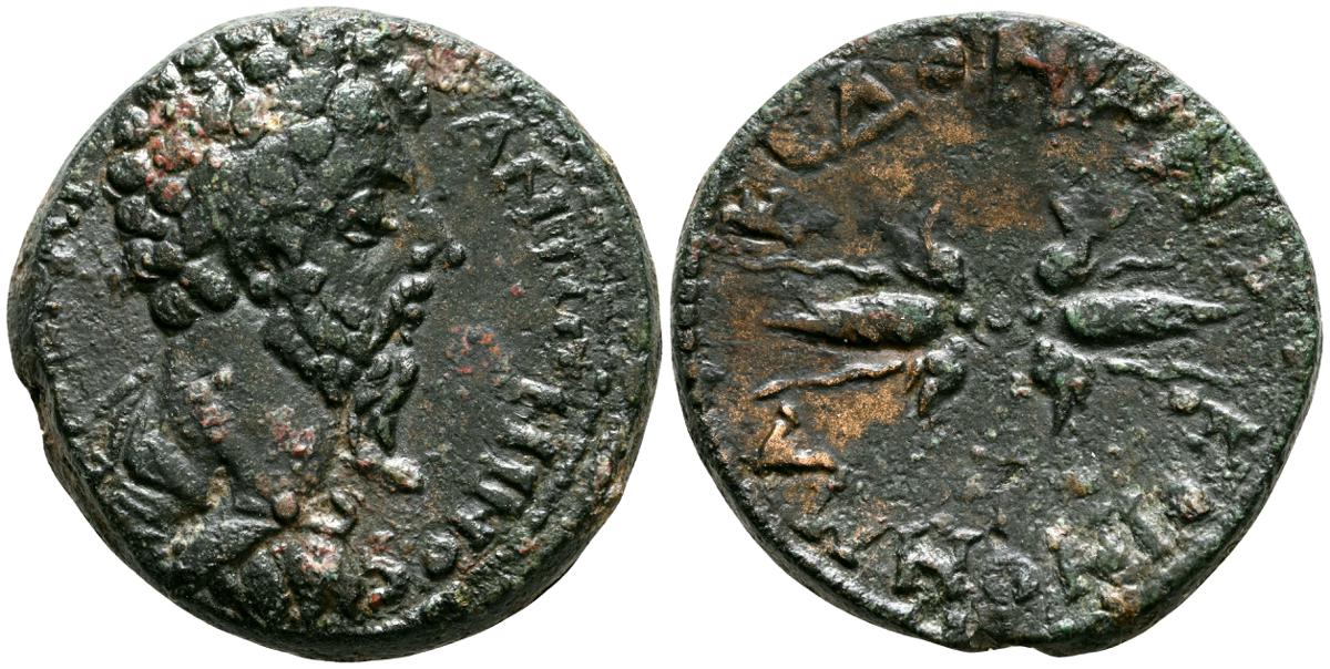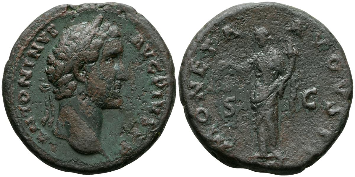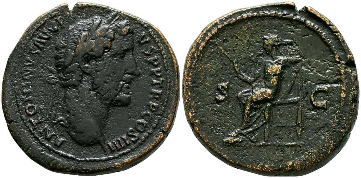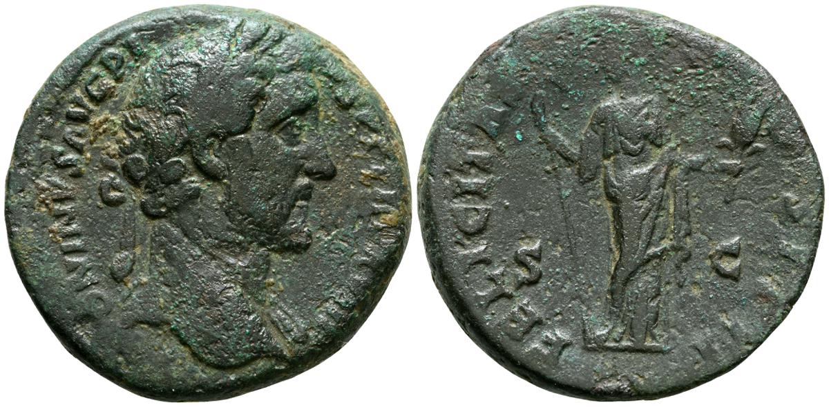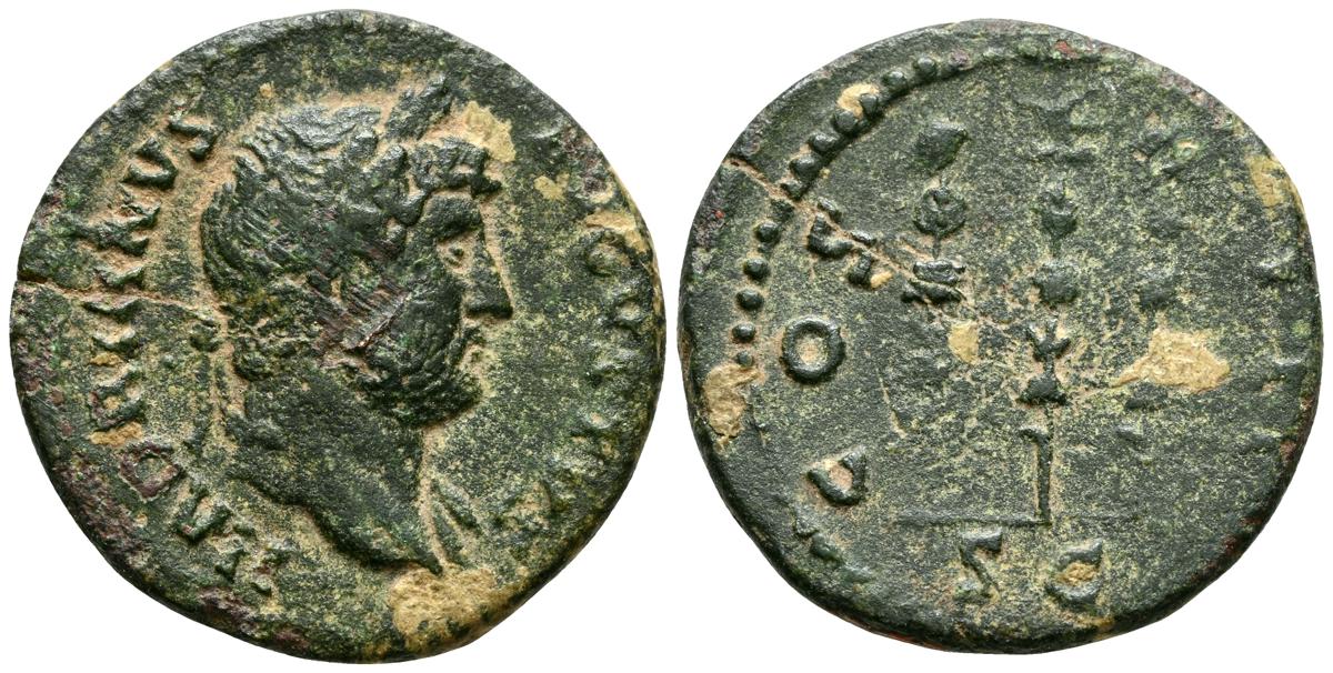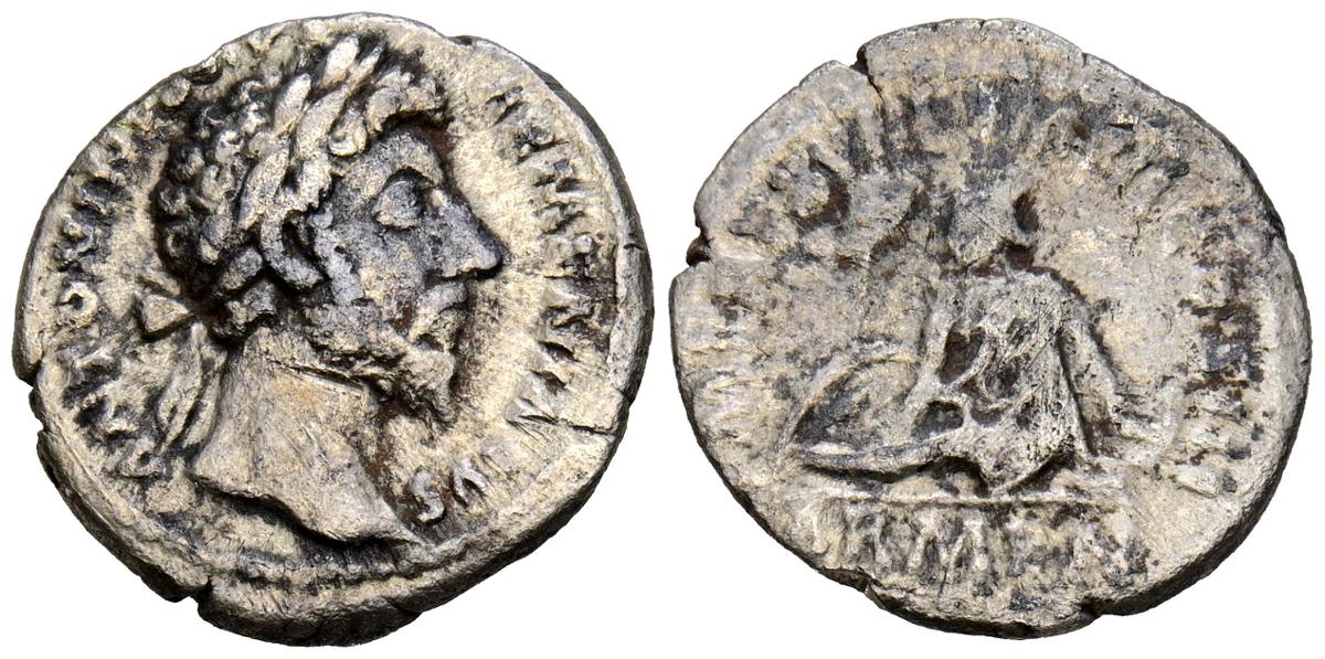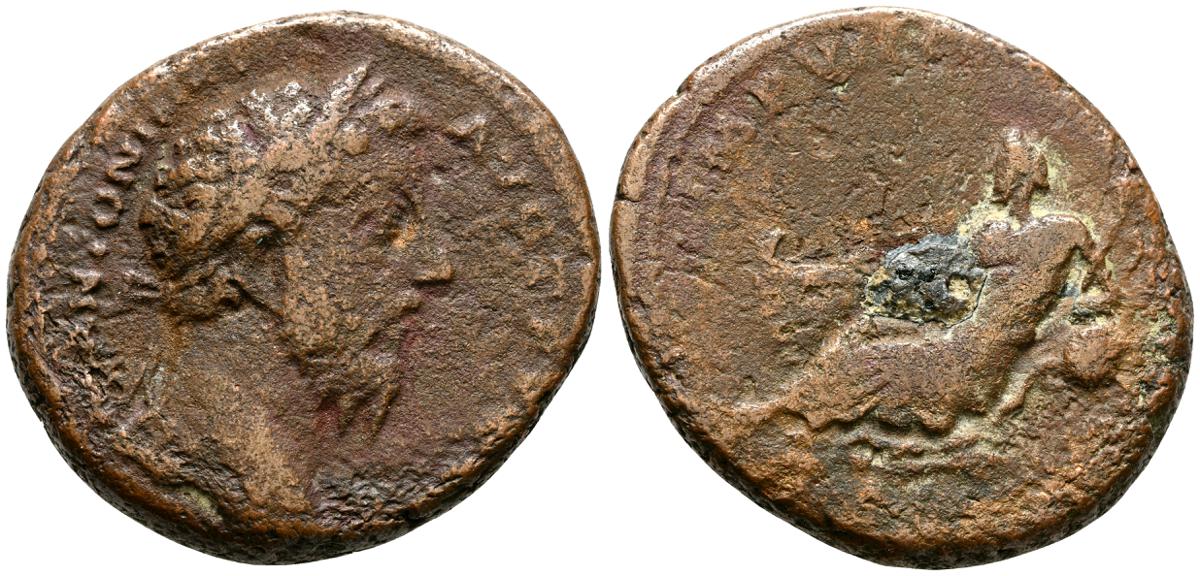 MARCO AURELIO. As. (Ae. 10,88g/25mm). 174-175 d. C. Roma. (RIC 1142). Anv: Cabeza laureada de Marco Aurelio a la derecha, alrededor leyenda: M ANTONINVS AVG TR P XXIX. Rev: Personificación del río Tíber reclinado hacia la izquierda, sosteniendo una caña en la mano izquierda, apoyando el brazo derecho en la proa del barco y apoyando el codo izquierdo en una jarra de la que fluye agua, entre: S-C, alrededor leyenda: IMP VII COS III. BC+. Escasa.