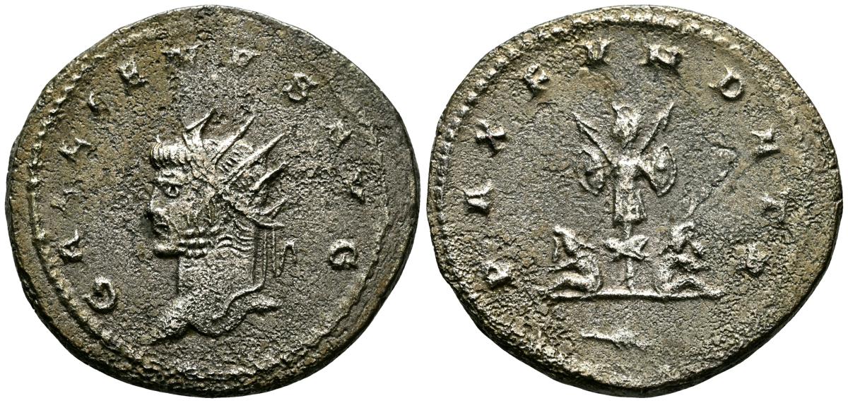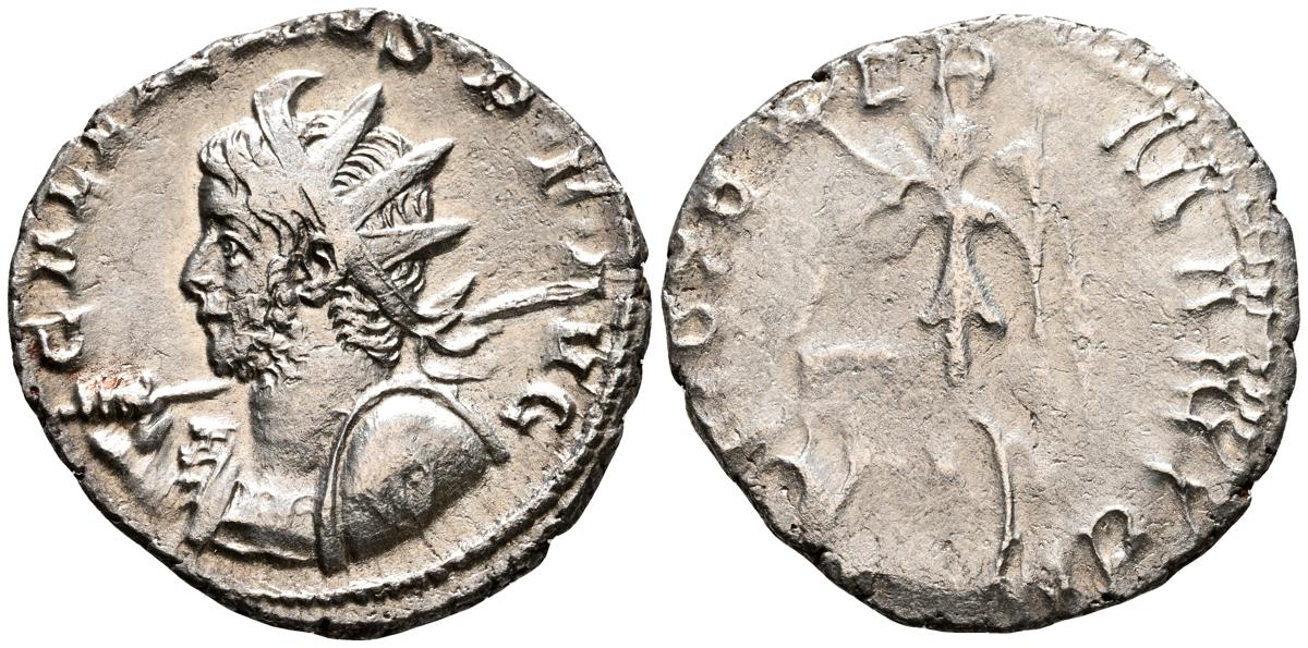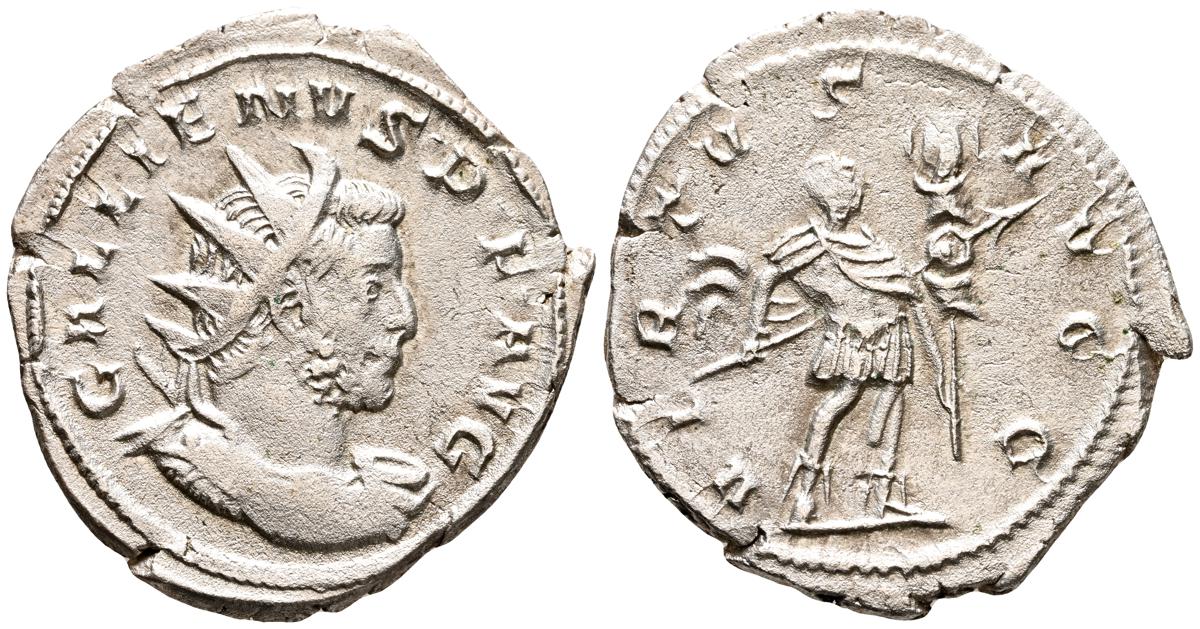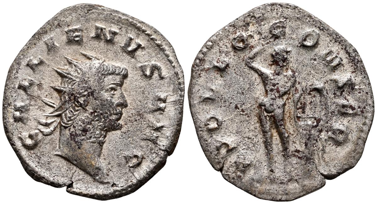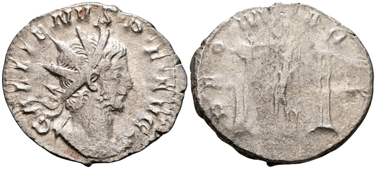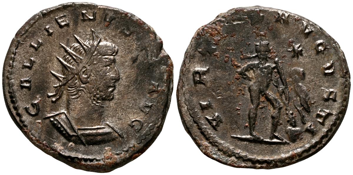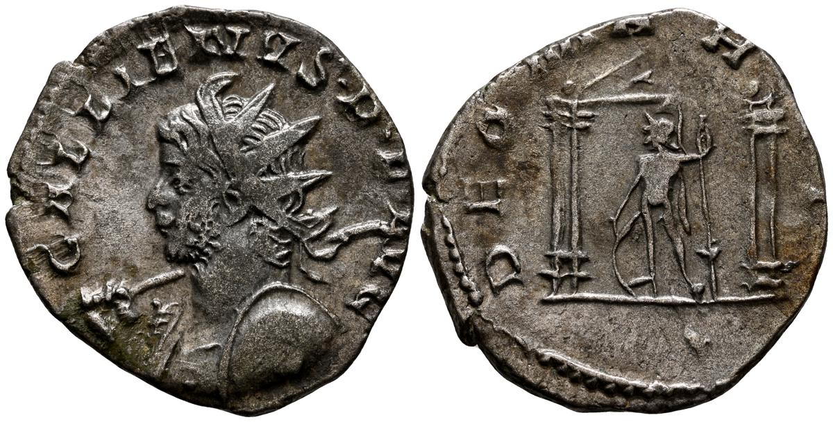 GALIENO. Antoniniano. (Ar. 2,84g/21mm). 258-259 d.C. Colonia. (RIC 10). Anv: Busto radiado y con coraza de Galieno a izquierda, portando lanza al hombro y escudo, alrededor leyenda: GALLIENVS P F AVG. Rev: Marte estante de frente, portando lanza y escudo, dentro de templo tetrástilo, alrededor leyenda: DEO MARTI. MBC/MBC-.