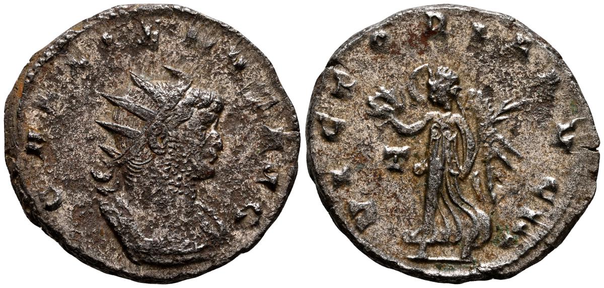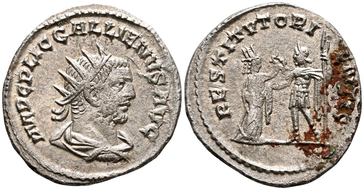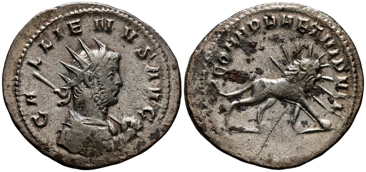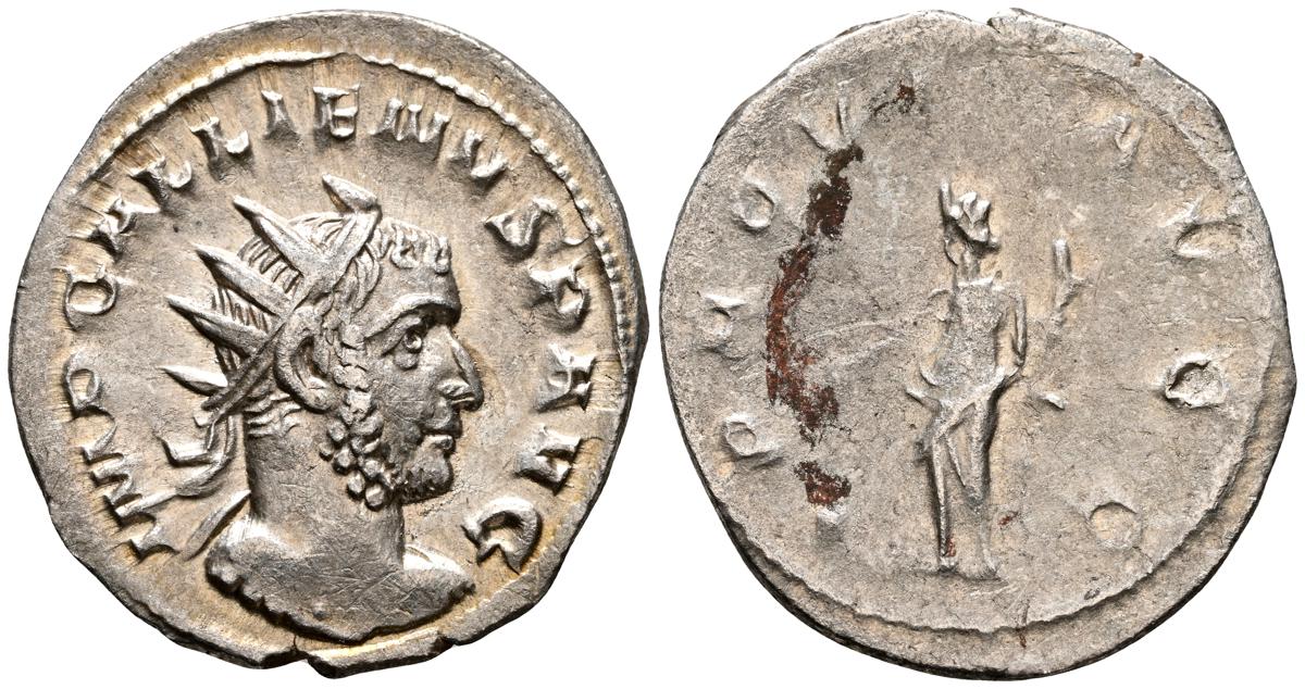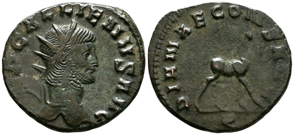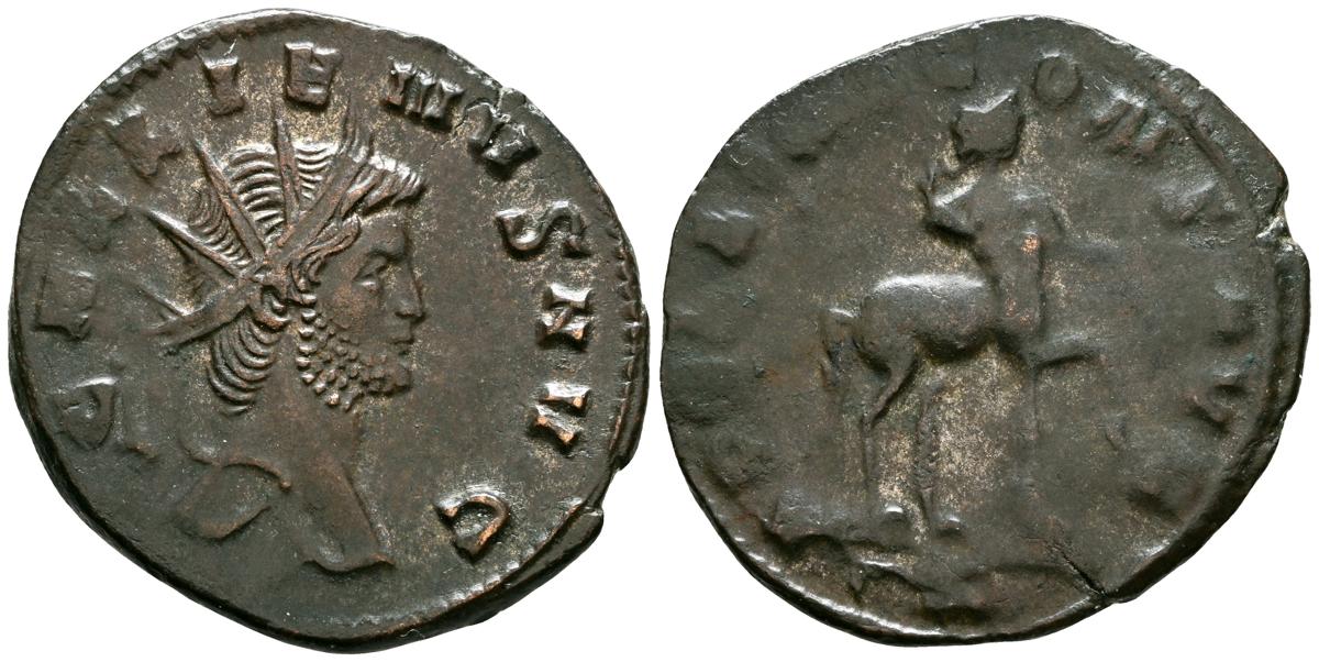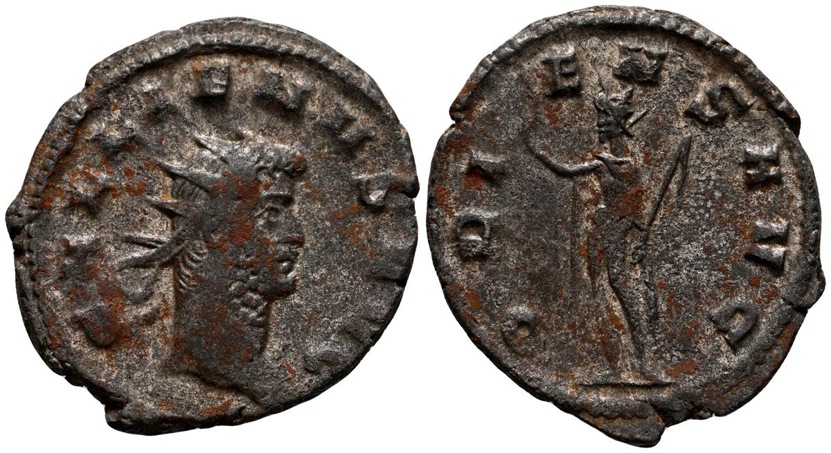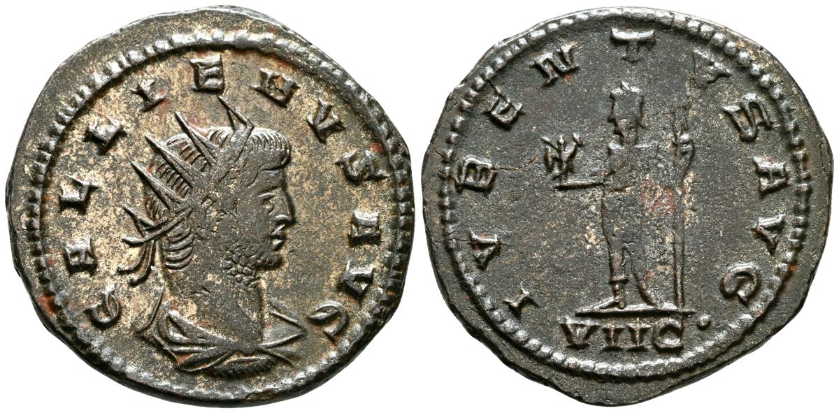 GALIENO. Antoniniano. (Ar. 2,84g/21mm). 258-259 d.C. Colonia. (RIC 10). Anv: Busto radiado y con coraza de Galieno a izquierda, portando lanza al hombro y escudo, alrededor leyenda: GALLIENVS P F AVG. Rev: Marte estante de frente, portando lanza y escudo, dentro de templo tetrástilo, alrededor leyenda: DEO MARTI. MBC/MBC-.
