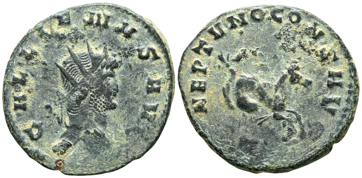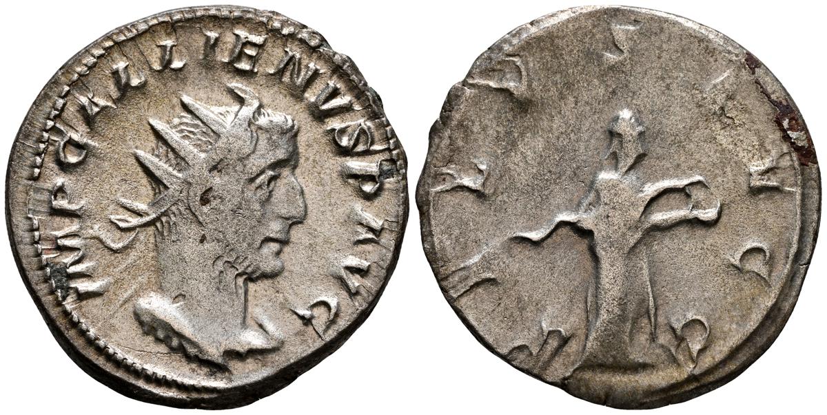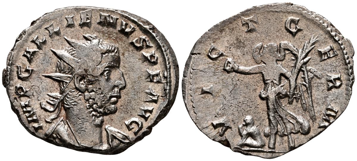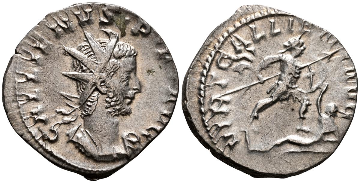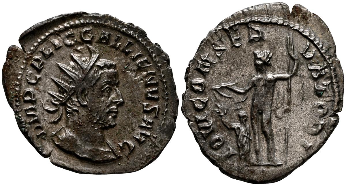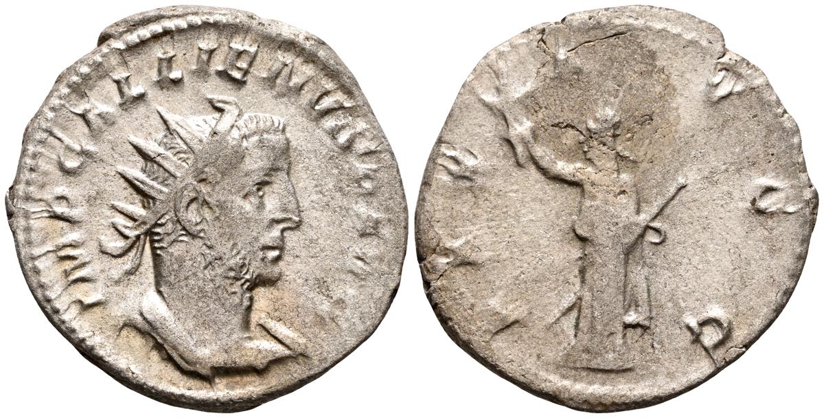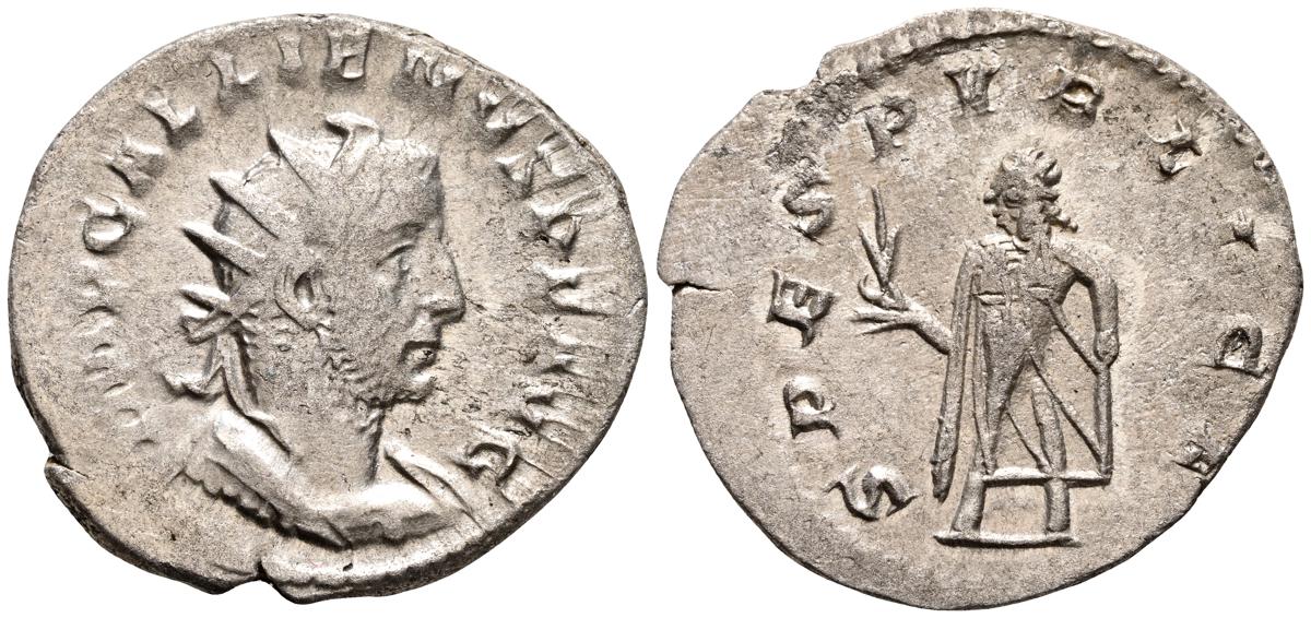 GALIENO. Antoniniano. (Ar. 2,84g/21mm). 258-259 d.C. Colonia. (RIC 10). Anv: Busto radiado y con coraza de Galieno a izquierda, portando lanza al hombro y escudo, alrededor leyenda: GALLIENVS P F AVG. Rev: Marte estante de frente, portando lanza y escudo, dentro de templo tetrástilo, alrededor leyenda: DEO MARTI. MBC/MBC-.