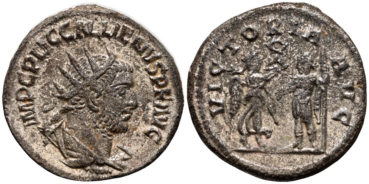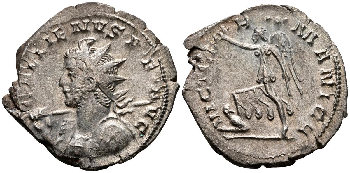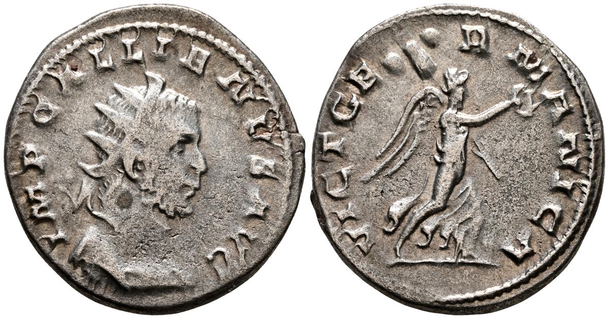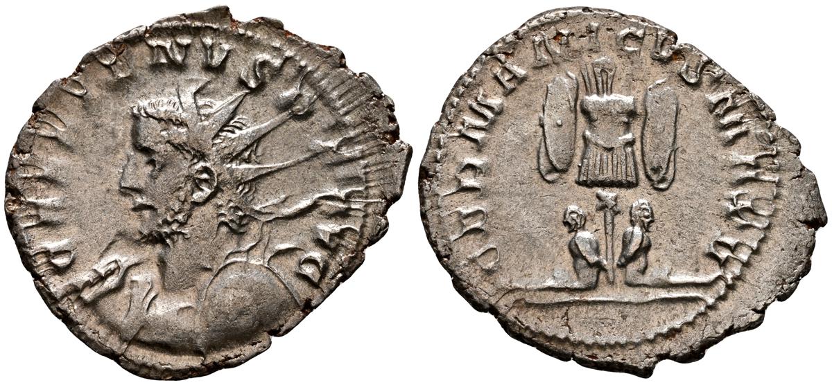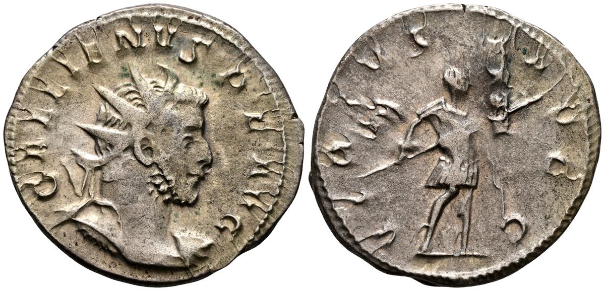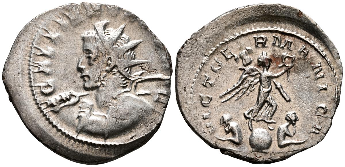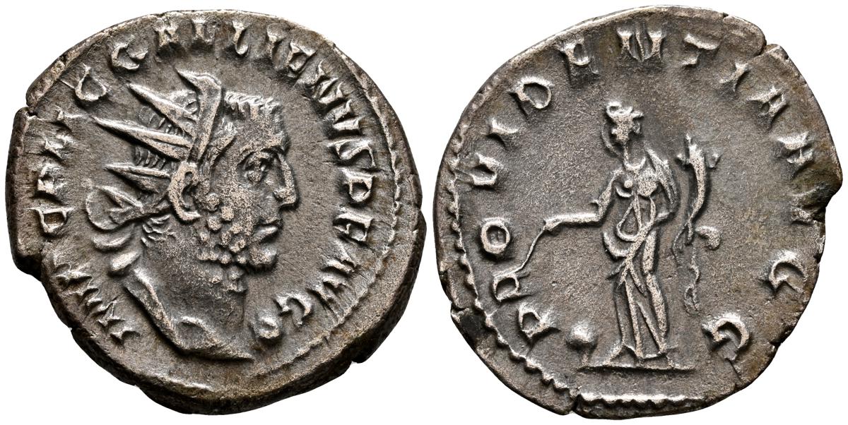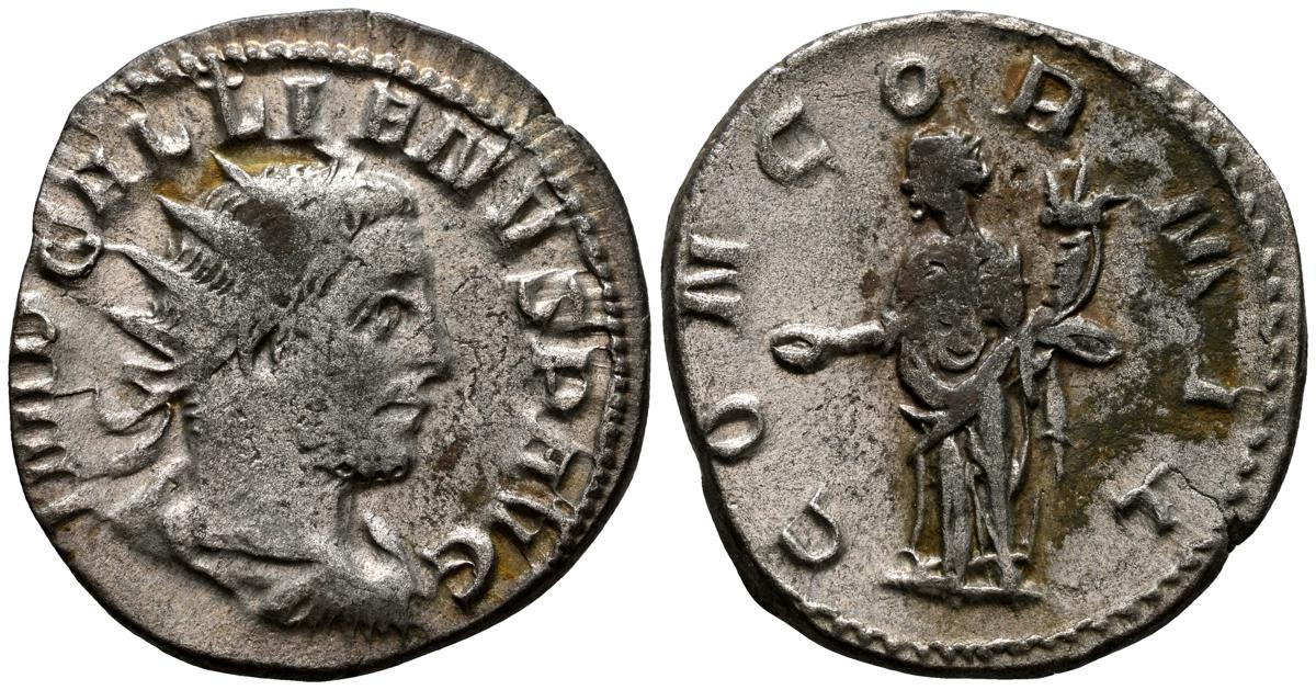 GALIENO. Antoniniano. (Ar. 2,84g/21mm). 258-259 d.C. Colonia. (RIC 10). Anv: Busto radiado y con coraza de Galieno a izquierda, portando lanza al hombro y escudo, alrededor leyenda: GALLIENVS P F AVG. Rev: Marte estante de frente, portando lanza y escudo, dentro de templo tetrástilo, alrededor leyenda: DEO MARTI. MBC/MBC-.