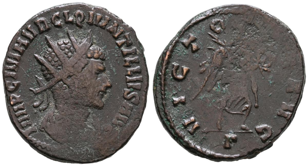 QUINTILO. Antoniniano. (Ae. 4,65g/21mm). 270 d.C. Roma. (RIC 33). Anv: Busto radiado y con coraza de Quintilo a derecha, alrededor leyenda: IMP C M AVR CL QVINTILLVS AVG. Rev: Victoria avanzando a derecha portando corona de laurel a derecha, en exerg o: Γ, alrededor leyenda: VICTORIA AVG. MBC+. Vanos.