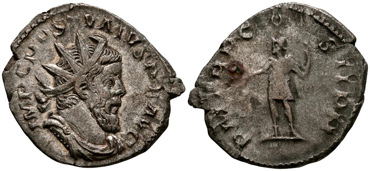 POSTUMO. Antoniniano. (Ar. 3,22g/23mm). 261 d.C. Treveri. (RIC 59). Anv: Busto radiado, drapeado y con coraza de Póstumo a derecha, alrededor leyenda: IMP C POSTVMVS P F AVG. Rev: Fides estante a izquierda portando dos estandartes, alrededor leyenda: FIDES MILITVM. MBC+.