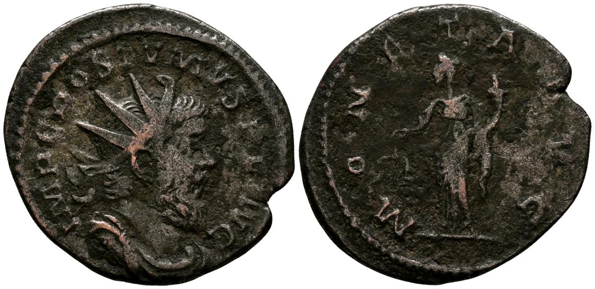 POSTUMO. Antoniniano. (Ar. 3,33g/22mm). 262-263 d.C. Colonia. (RIC 75). Anv: Busto radiado, drapeado y con coraza de Póstumo a derecha, alrededor leyenda: IMP C POSTVMVS P F AVG. Rev: Moneta estante a izquierda portando escalas y cornucopia, alrededor leyenda: MONETA AVG. MBC-.