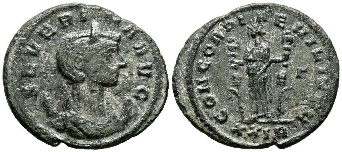 SEVERINA. Antoniniano. (Ae. 2,93g/23mm). 270-275 d.C. Roma. (RIC 1818). Anv: Busto diademado y drapeado de Severina a derecha sobre creciente, alrededor leyenda: SEVERINA AVG. Rev: Concordia estante a izquierda sosteneiendo estandartes, en exergo XXIR, alrededor leyenda: CONCORDIAE MILITVM. MBC. Escasa.