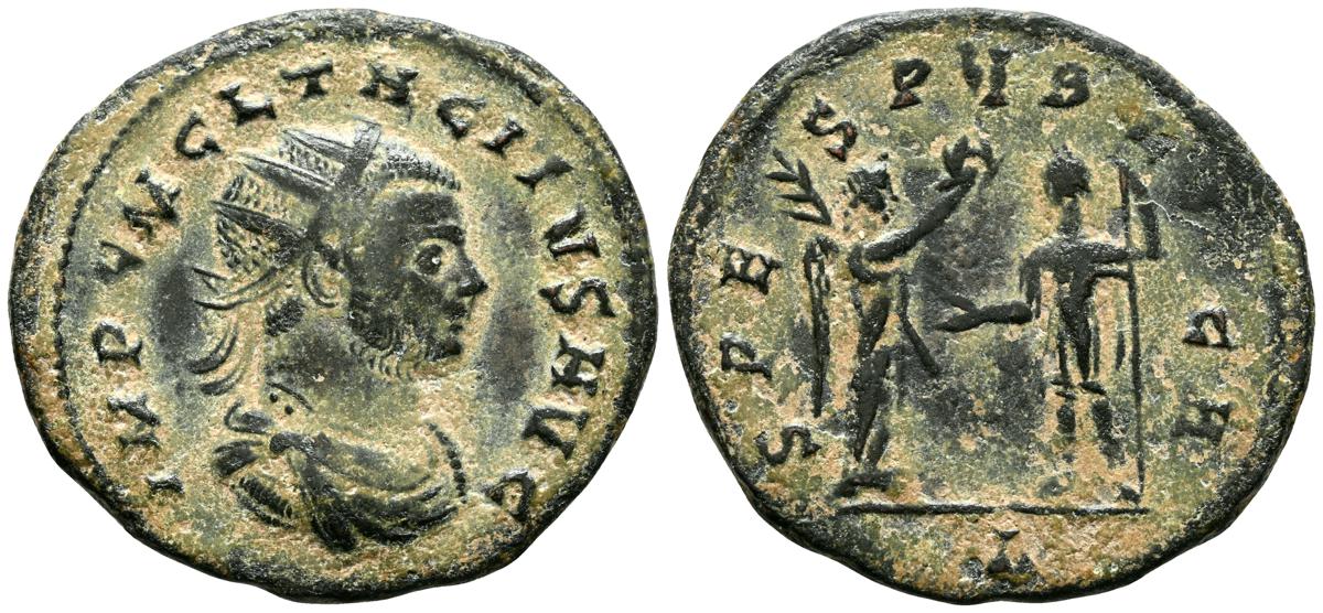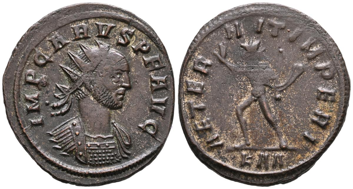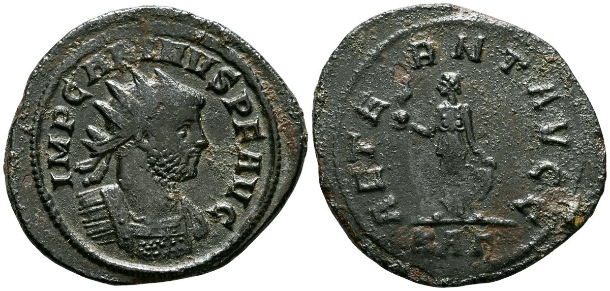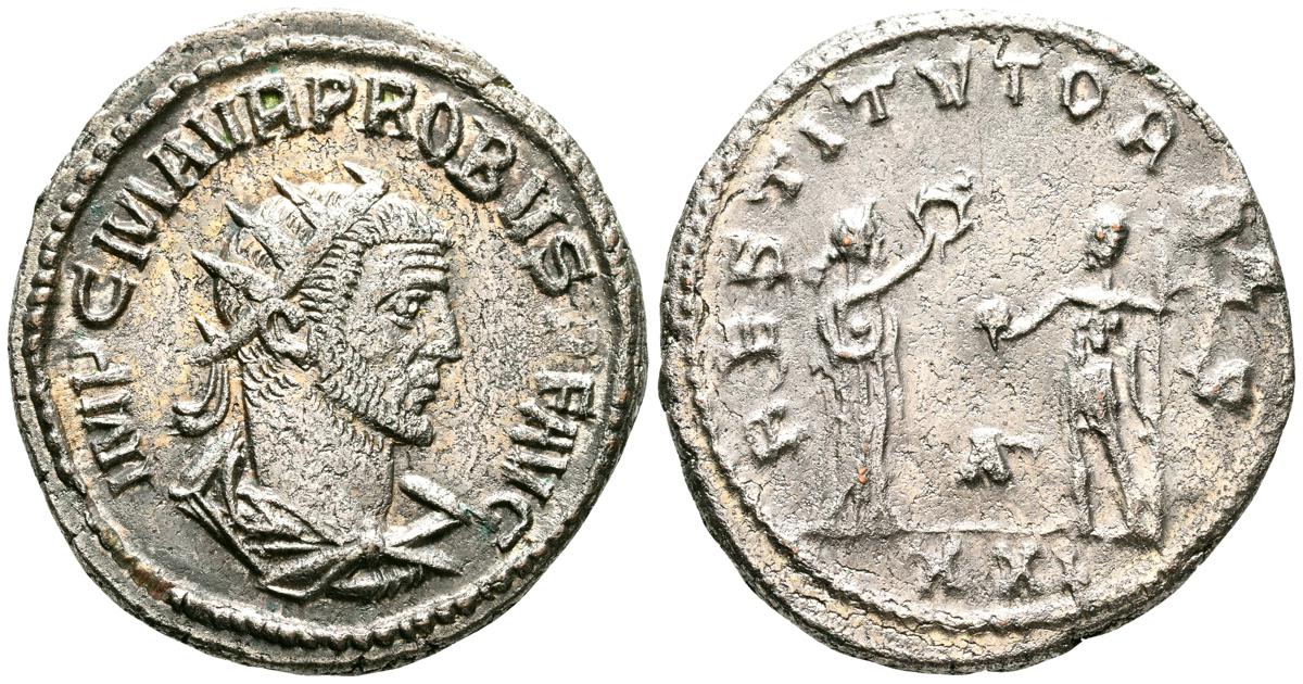 PROBO. Antoniniano. (Ae. 4,21g/22mm). 276 d.C. Antioquía. (RIC 925). Anv: Busto radiado, drapeado y con coraza de Probo a derecha, alrededor leyenda: IMP C M AVF PROBVS P F AVG. Rev: Mujer estante a derecha coronanado a Probo estante a izquierda portando cetro, entre ellos A, en exergo: XXI, alrededor leyenda: RESTITVT ORBIS. MBC. Restos de plateado original.