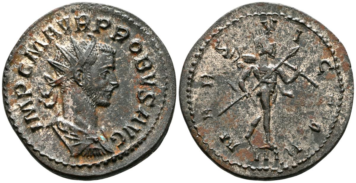 PROBUS. Antoniniano. (Ve. 3,88g/23mm). 277 d.C. Lugdunum. (RIC 83). Anv: Busto radiado y drapeado de Probo a la derecha, alrededor de la leyenda: IMP C M AVR PROBVS AVG. Rev: Marte avanzando hacia la derecha llevando lanza y trofeo, en exergo: III, alrededor de la leyenda: MARS VICTOR. MBC+. Restos del brillo original.