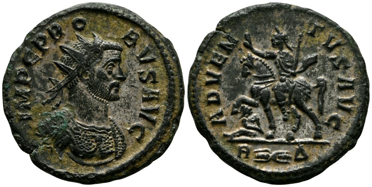 PROBO. Antoniniano. (Ve. 3,45g/21mm). 279 D.C. Roma. (RIC 158). Anv: Busto radiado y con coraza de Probo a derecha, alrededor leyenda: IMP C PROBVS AVG. Rev: Probo al paso a caballo a izquierda portando cetro y alzando mano derecha, a sus pies cautiv o, en exergo: A-fúlmen-Δ, alrededor leyenda: ADVENTVS AVG. MBC+. Restos de plateado original.