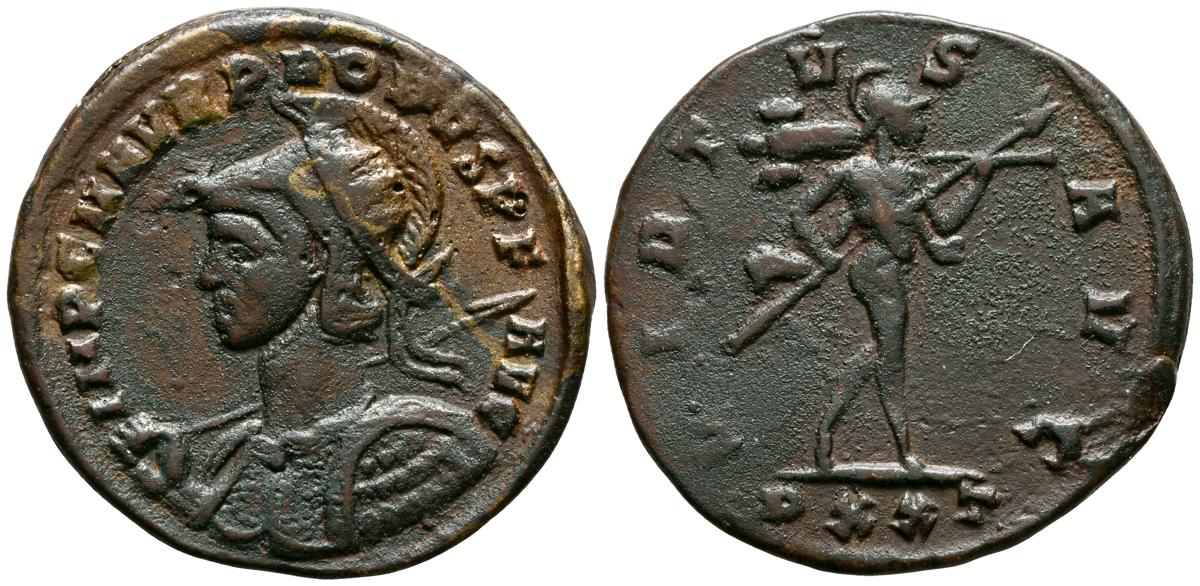 MAXIMINO II. Follis. (Ar. 4,38g/21mm). 310-313 d.C. Antioquía. (RIC 169b). Anv: Cabeza laureada de Maximino II a la derecha, alrededor leyenda: GAL VAL MAXIMINVS NOB CAES. Rev: Virtus avanzando a derecha portando lanza, trofeo y arrastrando cautivo, en campo: estrella-I, en exergo: ANT, alrededor leyenda: VIRTVS EXERCITVS. MBC-.