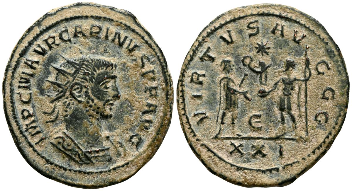 CARINO. Antoniniano. (Ae. 3,82g/22mm). 282-283 d.C. Cícico. (RIC 125). Anv: Busto radiado y drapeado de Carino a derecha, alrededor leyenda: IMP M AVR CARINVS P F AVG. Rev: Carino estante a derecha recibiendo Victoria de Júpiter estante a izquierda portando cetro, entre ellos E, en exergo: XXI, alrededor leyenda: VIRTVS AVG GG. MBC-.