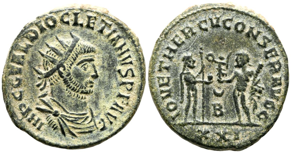 DIOCLECIANO. Antoniniano. (Ae. 4,40g/22mm). 285 d.C. Antioquía. (RIC 323). Anv: Busto radiado y con coraza de Diocleciano a derecha, alrededor leyenda: IMP C C VAL DIOCLETIANVS P F AVG. Rev: Júpiter estante a derecha portando lanza y globo enfrentado a Hércules estante a izquierda portando Victoria con corona de laurel, mazo y piel de león, entre ellos, creciente y B, en exergo: XXI, alrededor leyenda: IOV ET HERCV CONSER AVGG. MBC+.
