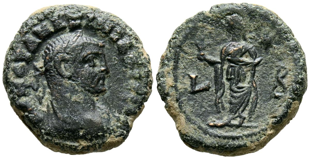 MAXIMIANO. Tetradracma. (Ae. 7,18g/20mm). Año 2 (286-287 d.C.). Alejandría. (Emmett 4114). Anv: Busto laureado de Claudio II a derecha, alrededor leyenda griega: Α Κ Μ ΟΥΑ ΜΑΞΙΜΙΑΝΟϹ ϹЄΒ. Rev: Elpis a izquierda sosteniendo flor, en campo L-B. MBC.